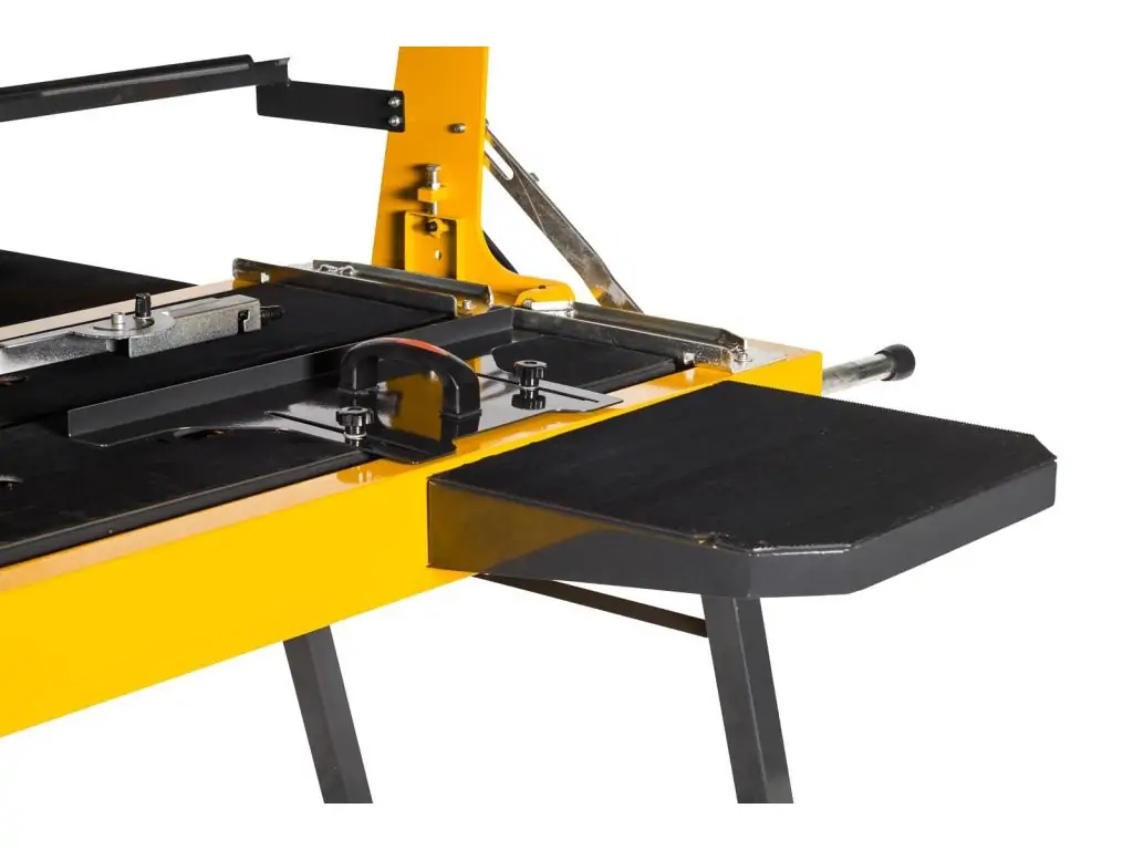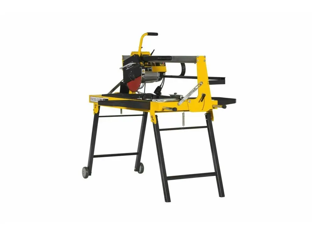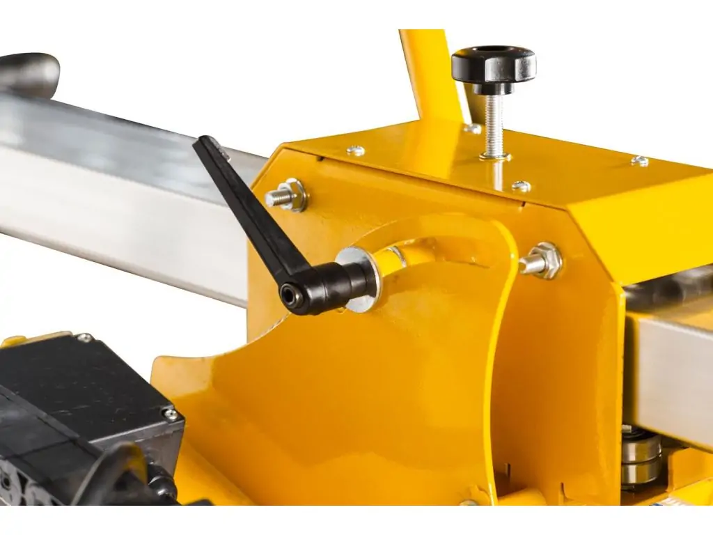Ріжуча голова має кут нахилу до 45 градусів та можливість опускання для виконання поперечних різів. Двигун потужністю 2,2 кВт забезпечує високу продуктивність, а швидкість обертання ріжучого диска