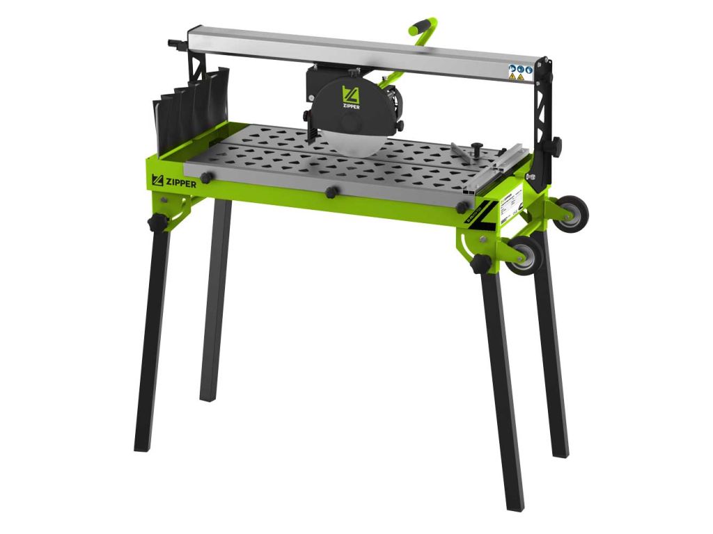 Плиткорізний верстат Zipper ZI-FS200-720 оснащений алмазним диском діаметром 200 мм, транспортними колесами, водяним насосом для охолодження та кареткою, що забезпечує плавне та чисте різання на будівельному майданчику.