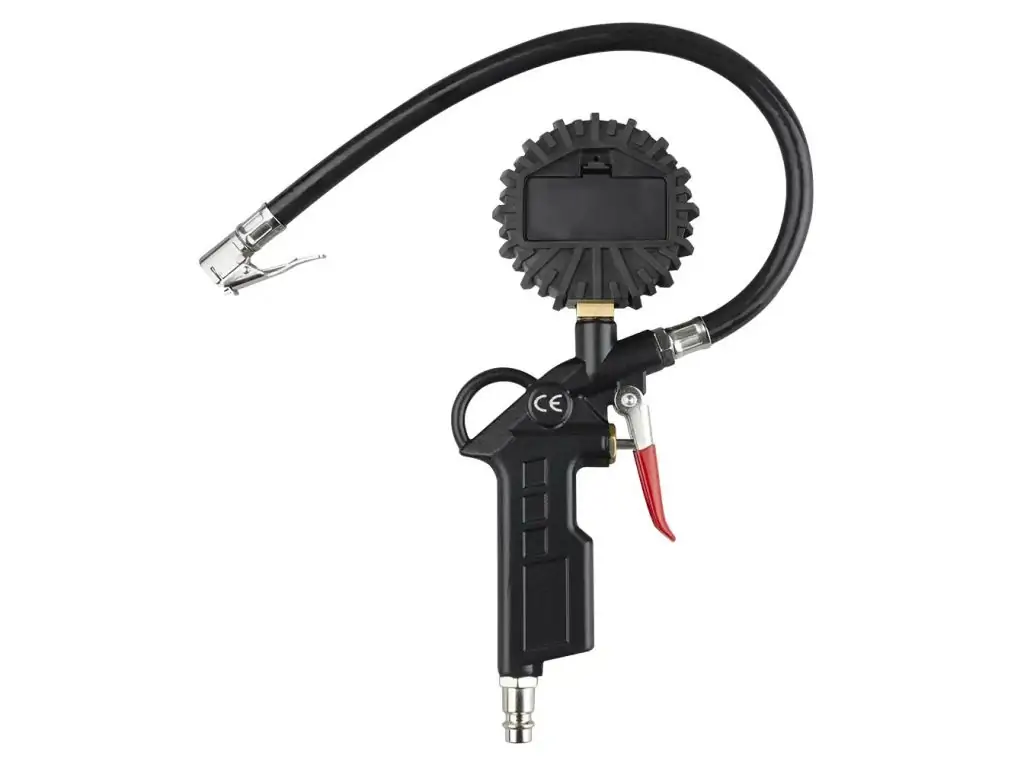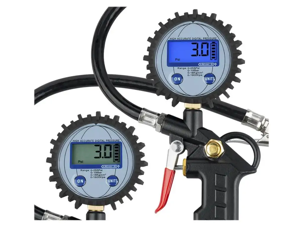 Для зчитування показників тиску використовується великий електронний манометр. Гумовий корпус манометра захищає його від пошкоджень при падінні та ударах. Гнучкий шланг довжиною 350 мм забезпечує легке підключення до вентиля шини навіть у важкодоступних місцях. Клапан для випуску повітря розташований під великим пальцем, тому можна швидко скинути надлишковий тиск. Завдяки легкій, компактній конструкції та швидкості підключення і налаштувань, такий манометр-пістолет для шин надзвичайно зручний в експлуатації та зберіганні.