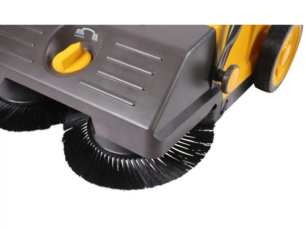 Оператор штовхає підмітальну машину вперед, що запускає обертовий рух щіток. Обертаючись, щітки збирають пил і дрібне сміття у спеціальний контейнер.