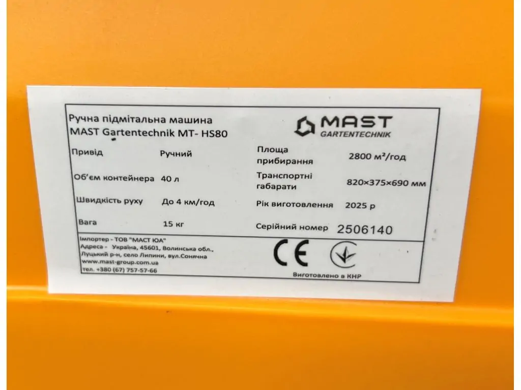 Ручна підмітальна машина MAST Gartentechnik MT-HS80 призначена для швидкого прибирання сухого сміття (пил, пісок, земля, листя, тирса тощо) як на відкритих територіях, так і у закритих приміщеннях. Обертання передається через просту механічну передачу: при русі машини вперед колеса приводять у рух щітки.