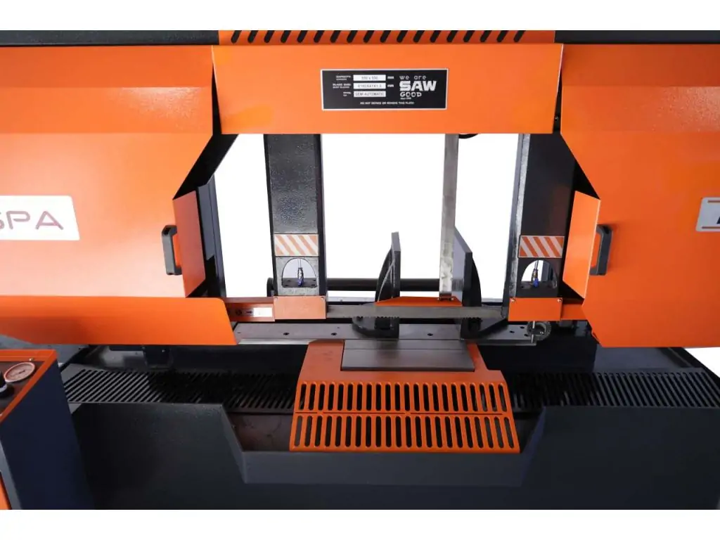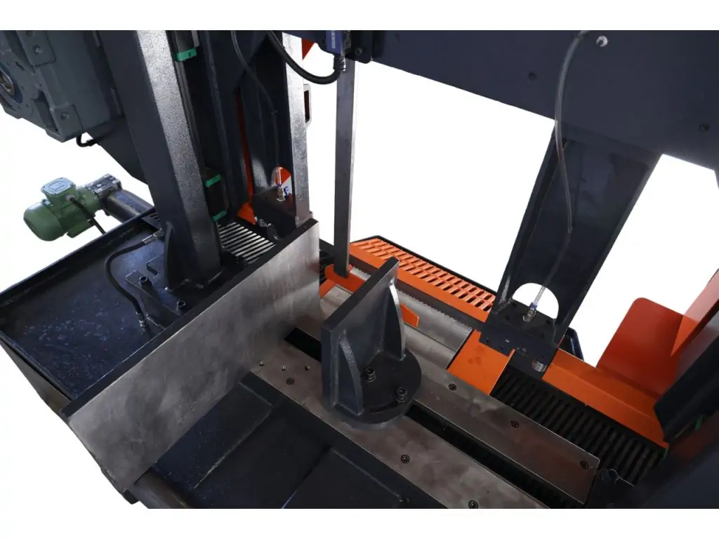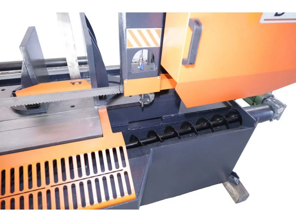 Гідравлічне опускання голови з регульованою швидкістю забезпечує плавну та контрольовану подачу, а автоматичне повернення голови скорочує робочий цикл і підвищує безпеку роботи. Висота полотна 41 мм гарантує рівний, перпендикулярний різ зі стабільною геометрією. Швидкість руху стрічки плавно регулюється у діапазоні 0-90 м/хв за допомогою частотного перетворювача. Завдяки двоколонній конструкції з товстостінної листової сталі, ця стрічкова пила для металоконструкцій зберігає жорсткість і стабільність навіть при граничних навантаженнях. Шнековий конвеєр для відводу стружки, система охолодження ЗОР та щітка для очищення полотна покращують чистоту різання і забезпечують його стабільно високу якість.