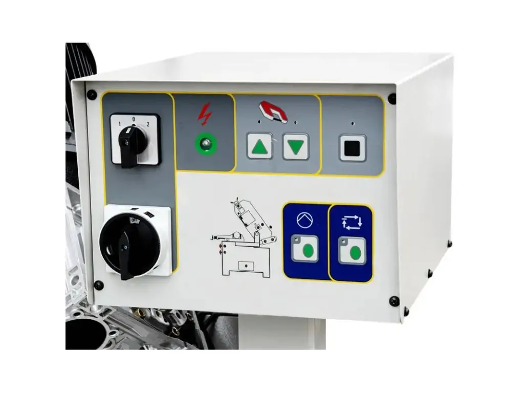 Машина оснащена ефективним насосом охолодження з замкнутим контуром, а привод передається через зубчасту передачу. Трифазний двигун має дві швидкості різання і термозахист. Додатково, пила обладнана годинниковим тензометром для контролю натягу стрічки та автоматичним вимикачем при обриві.