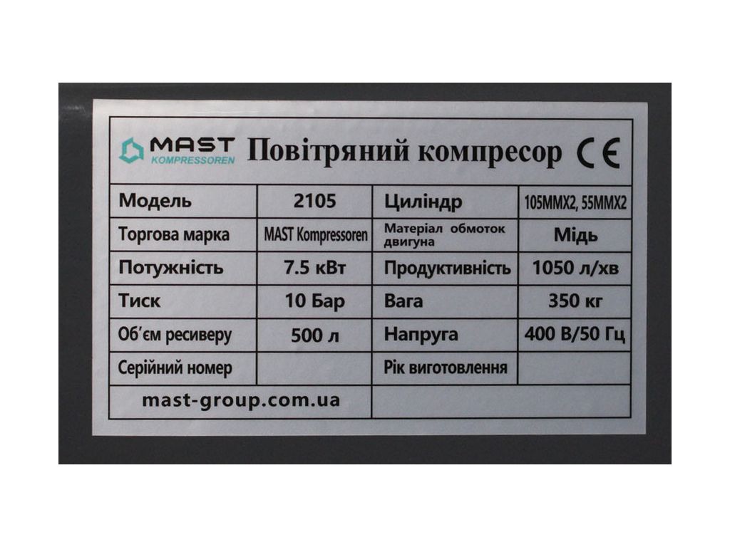 Плюси і мінуси поршневого компресора MAST 2105/500L 400V
