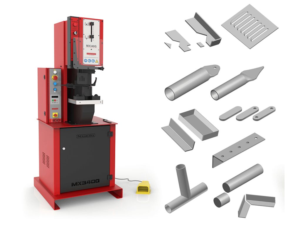 Гідравлічні прес-ножиці МX340G Nargesa вирізняються багатофункціональністю та виконують безліч операцій, як-от: перфорування листового металу, смугового металу, труби, куточка, швелера U-подібного профілю, тавра, швелера UPN, двотавра IPN, Гнуття, різання, пробивання. Гідравлічний пробивний прес багатофункціональний і простий у використанні, що робить його незамінним для роботи в ковальських майстернях.