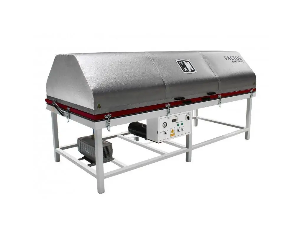 Вакуумний мембранний прес OPTIMAT FACTOR призначений для облицювання меблевих деталей й інших заготовок з масиву деревини та МДФ плівками ПВХ та іншим декоративним матеріалом. Забезпечує точне і якісне приклеювання за рахунок щільного прилягання заготовок і рівномірного тиску, що створюються за допомогою вакууму, а також оптимального температурного режиму. Час приклеювання - від 5 до 15 хвилин (в залежності від товщини облицювального матеріалу і заготовки).