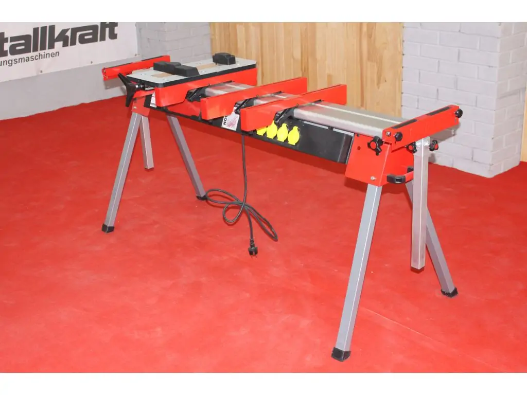 Універсальна підставка для пил Holzmann USK 2760 - це зручне пристосування для роботи з ручними пилами та лобзиками, настільними свердлильними верстатами, дрилями та іншим інструментом. Регулювання довжини у діапазоні 1500-2760 мм і окреме регулювання опорних роликів по висоті дозволяють максимально адаптувати підставку під конкретне завдання. Вбудований 4-позиційний подовжувач 230 В спрощує підключення електроінструменту. Для кріплення обладнання використовуються 2 рейки, які можна переміщати по підставці.