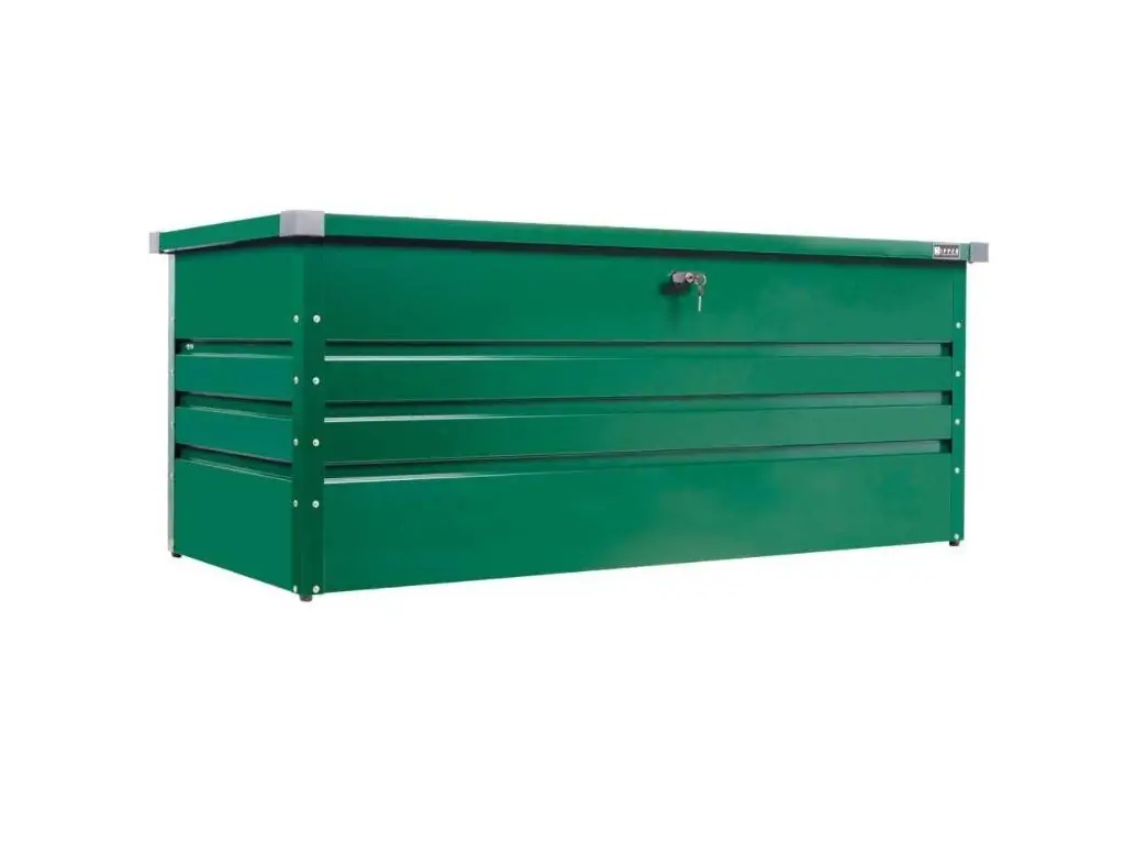 Ящик виготовлений зі стійкої до корозії та атмосферних впливів оцинкованої сталі, тому відмінно підходить для вуличного використання. Кришка витримує навантаження до 50 кг, що дозволяє використовувати її як додаткове місце для сидіння. Два газових амортизатори полегшують відкривання кришки і утримують її у відкритому положенні. Є механізм для встановлення замка (замок у комплект не входить). Форма кришки та бортів спроектована так, щоб вода стікала назовні, тому цей садовий контейнер надійно захищає речі від дощу та вологи.