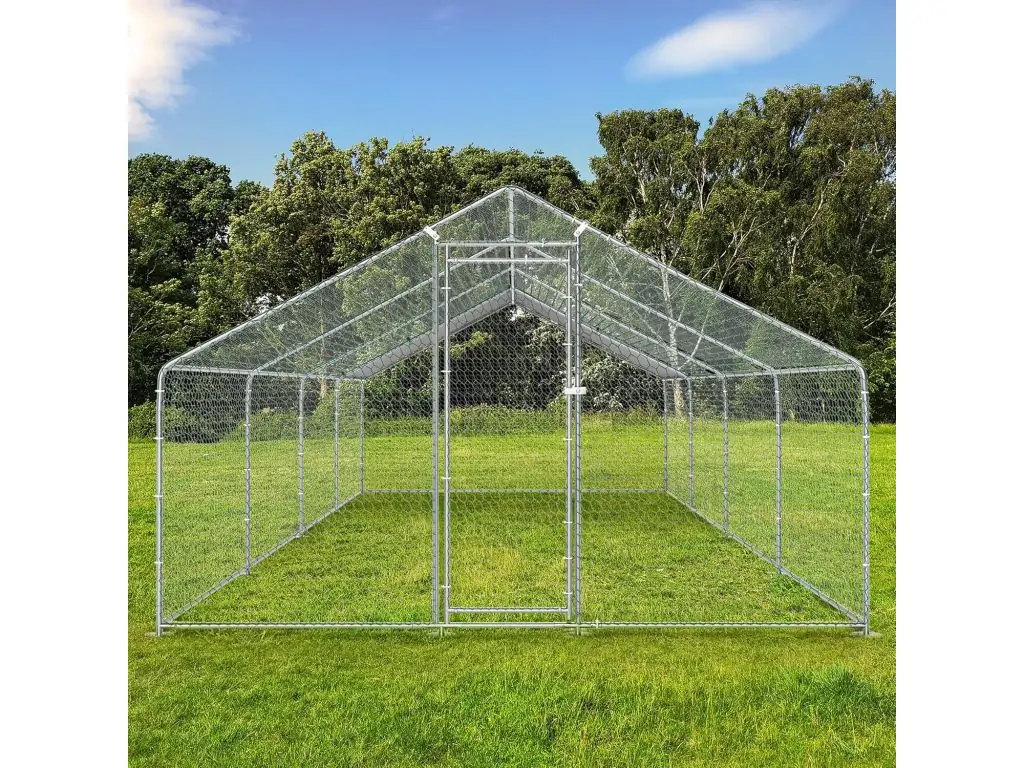 Каркас виготовлений з оцинкованої сталевої труби Ø25 мм, для покращення стійкості є фіксатори опор для грунту. Оцинкована сталева сітка з ПВХ покриттям і розміром отворів 0,9 мм надійно захищає птахів від хижаків і запобігає їх втечі. Половина накриття виконана з сітки, інша половина - з водонепроникного, стійкого до УФ променів матеріалу для захисту птиці від опадів і палючого сонця. Завдяки універсальності і надійності конструкції, можна використовувати цей вольєр для качок, курей, гусей та іншої домашньої птиці.