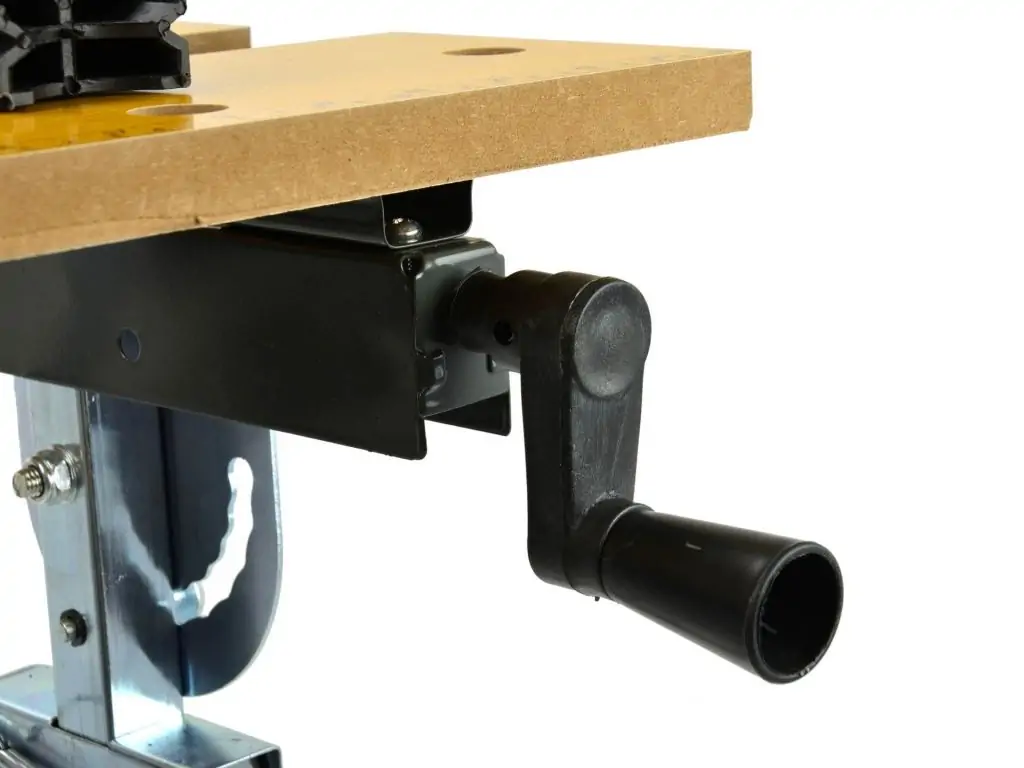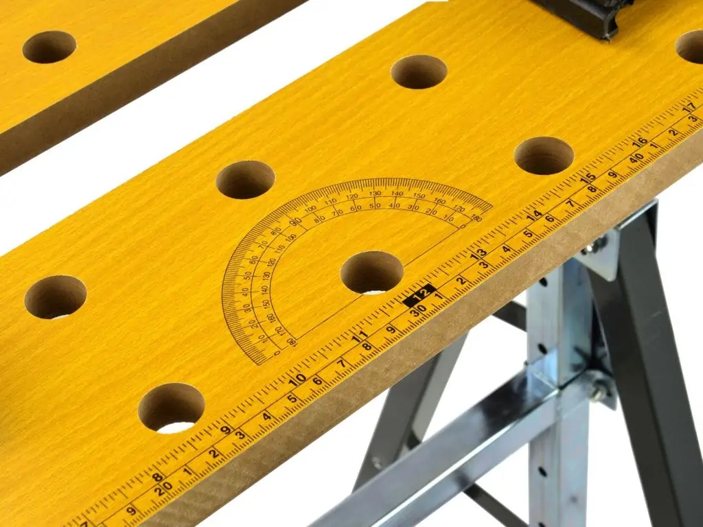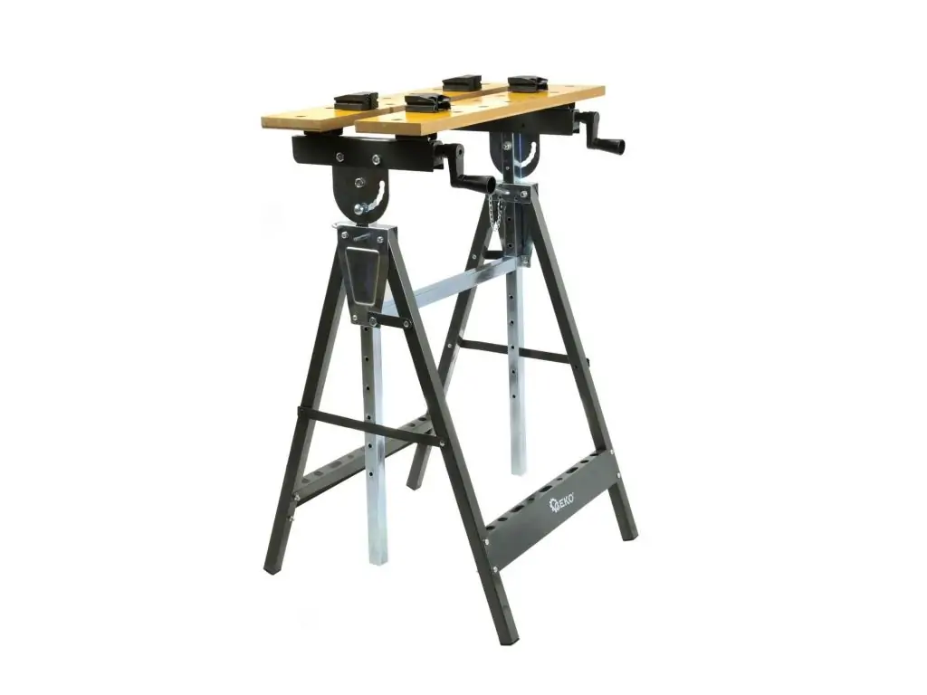 Верстак оснащений регульованими лещатами з максимальним розкриттям губок 210 мм, що забезпечує надійну фіксацію заготовок різного розміру і форми. Положення затискних губок регулюється шляхом їх переміщення у відповідні отвори на стільниці. На поверхню столу нанесені транспортир і масштабована в сантиметрах та дюймах лінійка. Для зручності транспортування і зберігання цей універсальний регульований верстак можна швидко скласти.