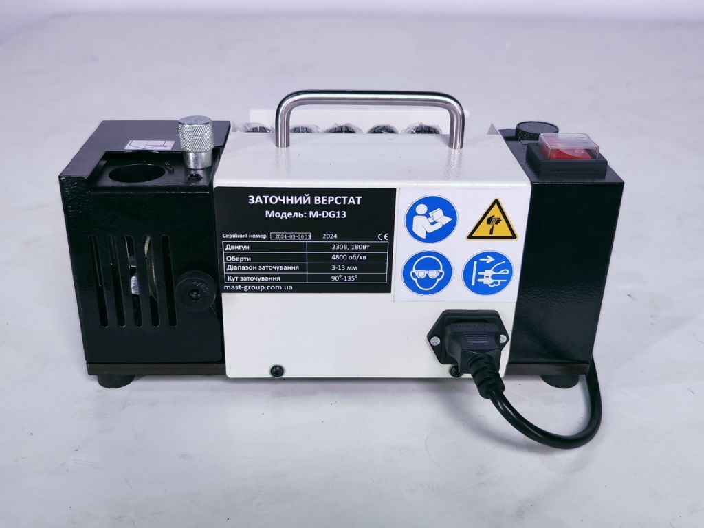 Верстат для заточування свердл MAST Metalltechnik M-DG13 230V швидко та якісно відновить гостроту вашого інструменту. Призначений для свердел діаметром 3-13 мм. Заточування здійснюється під кутом 90-135°, а стопорні пристрої забезпечують точність кута. Проста, міцна конструкція і легка та зрозуміла експлуатація забезпечують тривалу службу і зручне використання верстата. Живлення від напруги 230 В.