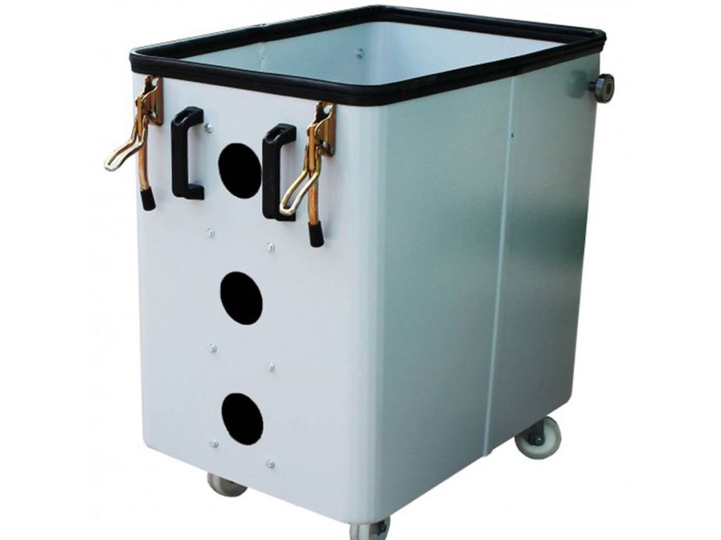 Пил і відходи від деревини збираються в викатні металеві бункери, які також встановлені на поворотних пластикових колесах, для зручності їх подальшого спорожнення. На кожному бункері є великі оглядові вікна для візуального контролю їх наповнення.