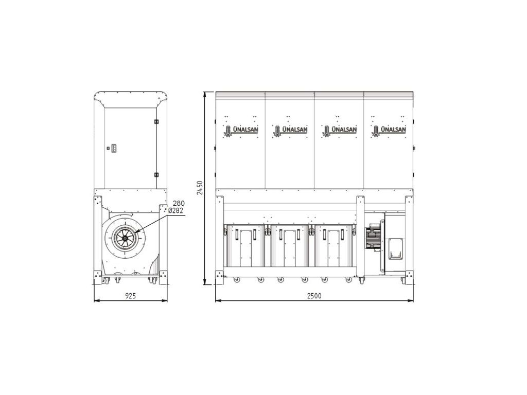 Пил і відходи від деревини збираються в викатні металеві бункери, які також встановлені на поворотних пластикових колесах, для зручності їх подальшого спорожнення. На кожному бункері є великі оглядові вікна для візуального контролю їх наповнення.
