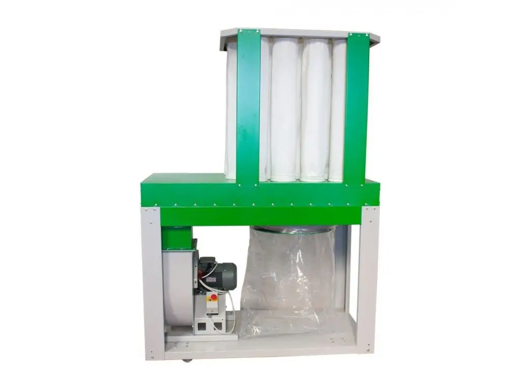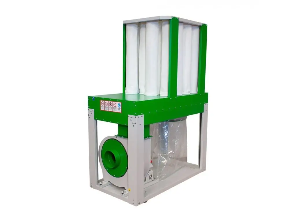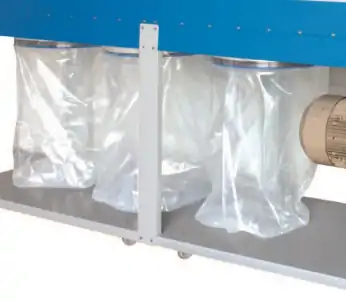 Пил і відходи від деревини збираються в поліетиленові прозорі мішки, які герметично закріплені металевими хомутами на корпусі аспіраційної установки.