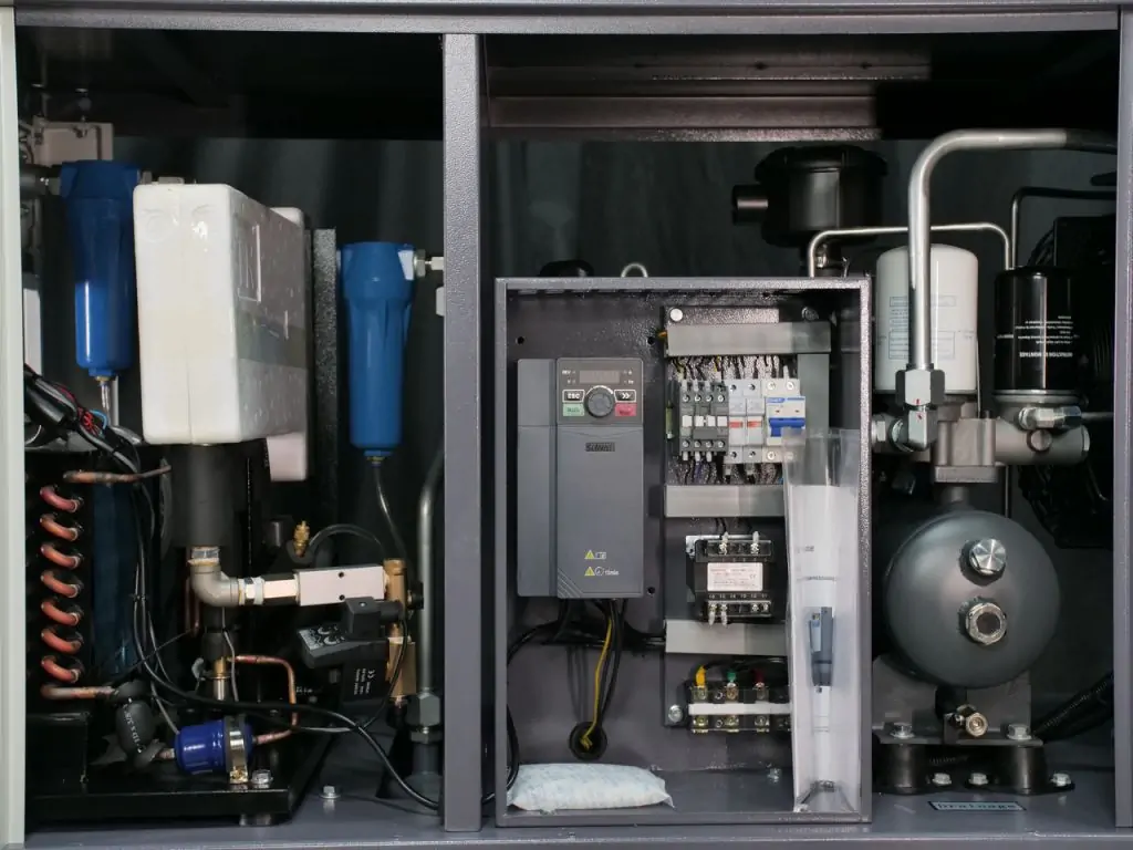 Вагомими перевагами представленої комбісистеми є двигун на постійних магнітах, який забезпечує високу питому потужність і вищий ККД, та інверторне керування, що дозволяє регулювати оберти двигуна та забезпечує його плавний пуск. Гвинтовий блок Baosy та електронні компоненти марок CHINT і Schneider Electric роблять цей гвинтовий компресор з осушувачем та ресивером надійним і безвідмовним, а сенсорна панель MAM-6070MSD забезпечує легке управління і максимальний контроль над його роботою. Завдяки компактному розміру і тихій роботі, таку комбісистему можна зручно встановити у робочому приміщенні без дискомфорту для персоналу. Всі компоненти ідеально підібрані по потужності і продуктивності та готові до роботи без потреби додаткового монтажу з’єднань і трубопроводів.