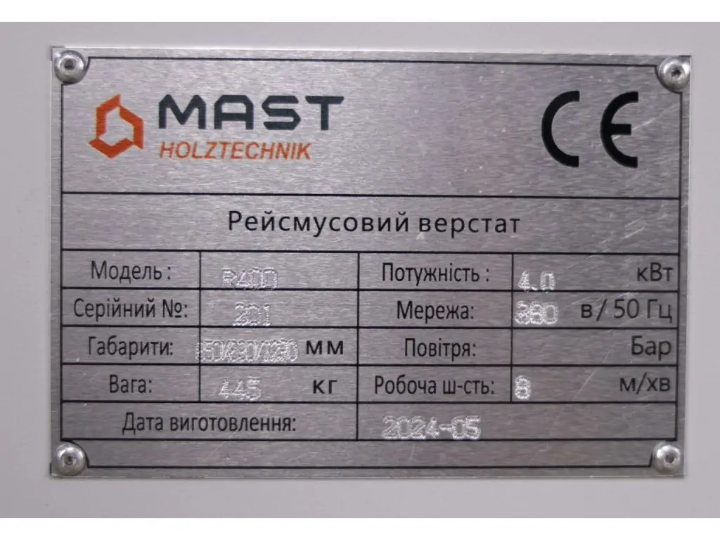 Рейсмусовий верстат MAST Holztechnik R400 використовується для калібрування дошки та бруса у розмір і по товщині. Підходить для заготовок товщиною від 8 до 200 мм і шириною до 400 мм. Обробка здійснюється за допомогою стругального валу з 4 лезами і швидкістю обертання 4800 об/хв. За один прохід знімає до 5 мм стружки.