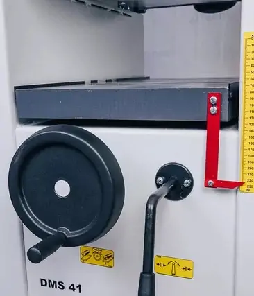 ПІДЙОМ СТОЛУ Підйом/опускання столу здійснюється за допомогою маховика. Жорстка фіксація столу за допомогою важеля. Налаштування товщини обробки за міліметровою шкалою. |