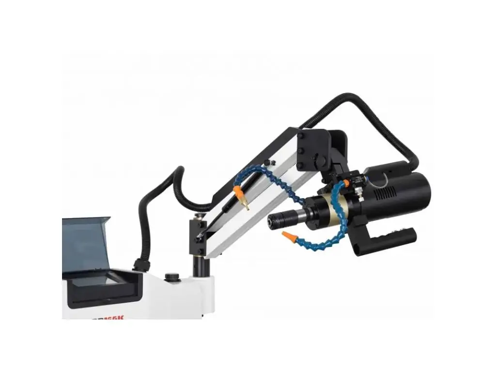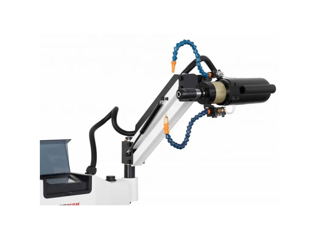 Верстат оснащений системою мікророзпилення мастила, яка забезпечує постійне охолодження з мінімальною витратою матеріалу, і продувною системою, яка видаляє стружку і підтримує максимальну видимість робочої зони. Швидкозатискний патрон дозволяє швидко і легко кріпити мітчики для наскрізних і глухих отворів. Цей настільний різьбонарізний верстат відмінно підходить для роботи зі сталлю, нержавіючою сталлю, алюмінієм і кольоровими металами.