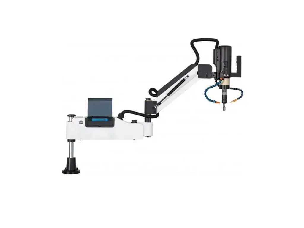 Шпиндель має швидкість обертання 156 об/хв і можливість правого та лівого обертання, які перемикаються вручну. Управління верстатом здійснюється з сенсорної панелі, розміщеної на поворотному кронштейні. На панелі можна запрограмувати крок і глибину нарізання різьби, швидкість обертання шпинделя й інші параметри обробки. Цей маніпулятор для нарізання різьби має ручний і автоматичний режими роботи, що робить його ефективним як для невеликих майстерень, так і для промислових виробництв.