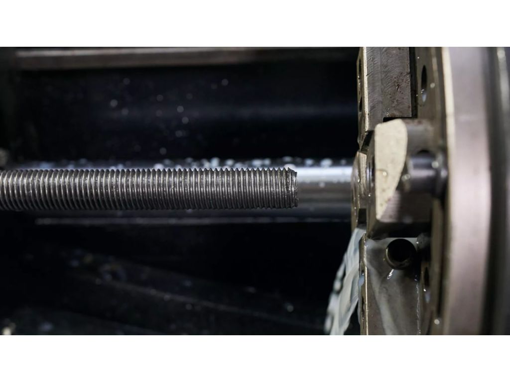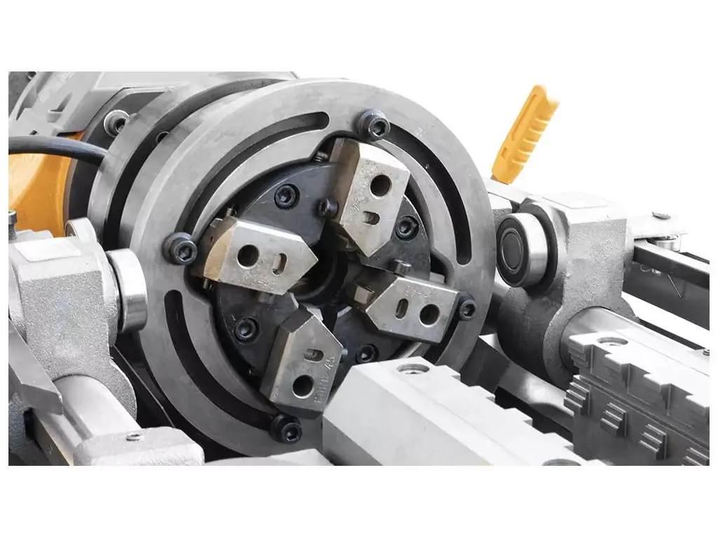 Шпиндель встановлений на прецизійних підшипниках і розрахований на значні осьові навантаження, що забезпечує плавний хід без биття. Плаваючий різьбонарізний патрон з осьовою та радіальною компенсацією забезпечує автоматичне підлаштування подачі під крок різьби, що компенсує невеликі похибки. Також цей різьбонарізний верстат для арматури оснащений системою обмеження довжини різьби, що дозволяє робити повторювані, однакові різьбові хвости без вимірювання для кожної заготовки.
