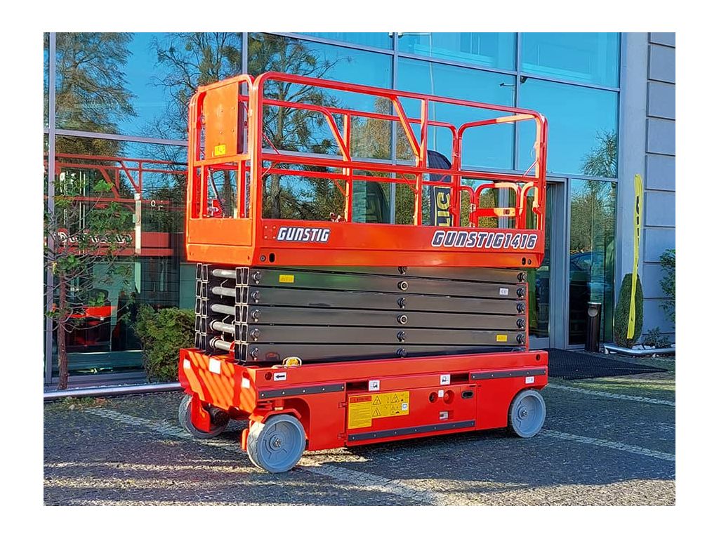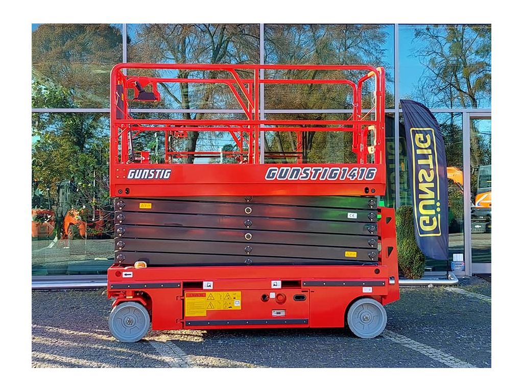 Ножичний підйомник Günstig 1416 - це надійне обладнання для роботи на висоті, яке можна використовувати як у закритих приміщеннях, так і під відкритим небом. Платформа розміром 2640x1120 мм має вантажопідйомність 230 кг і розрахована на 2 операторів. Для безпечності роботи є захисна огорожа і рифлене покриття, яке покращує зчеплення взуття з поверхнею. Висота платформи - 13,7 м, робоча висота - 15,7 м. Для розширення радіуса роботи є висувна платформа довжиною 900 мм, яка витримує навантаження до 113 кг.