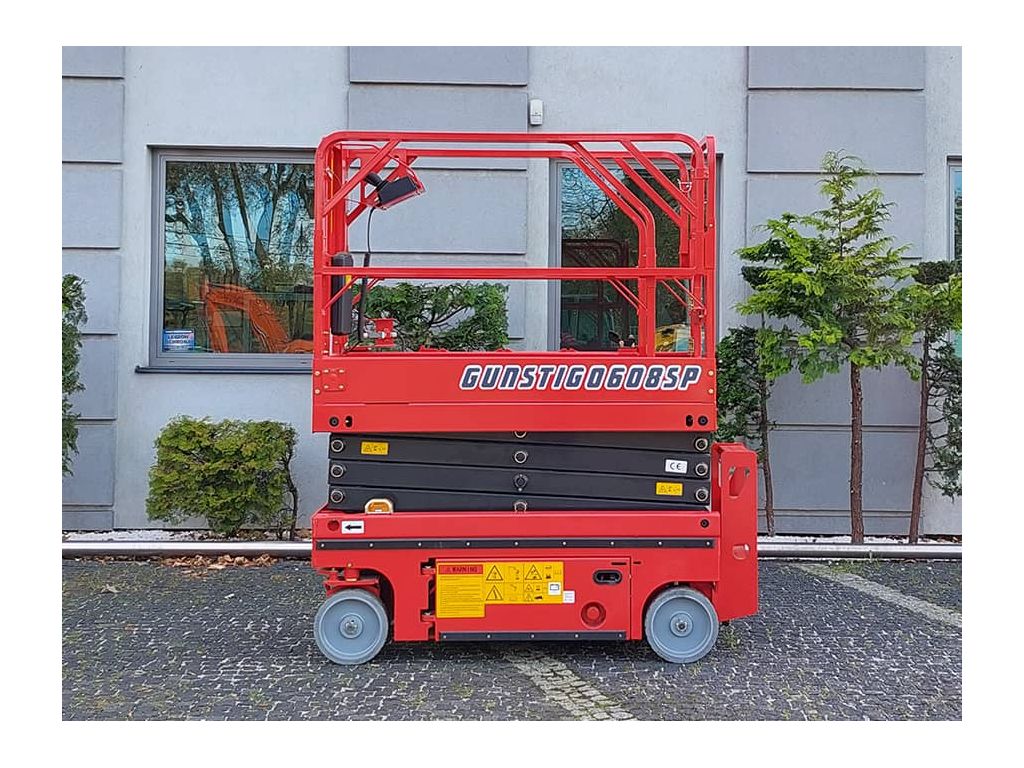 Ножичний підйомник Günstig 0608SP призначений для підйому людей і обладнання на будівництві, в складах та інших сферах, де необхідне виконання робіт на висоті. Розмір підйомної платформи - 1670x740 мм. Висота платформи - 5,8 м, робоча висота - 7,8 м. Розрахований на 2 операторів або на максимальне навантаження 230 кг. Для збільшення робочої зони є висувна платформа довжиною 900 мм, вантажопідйомність якої становить 113 кг.