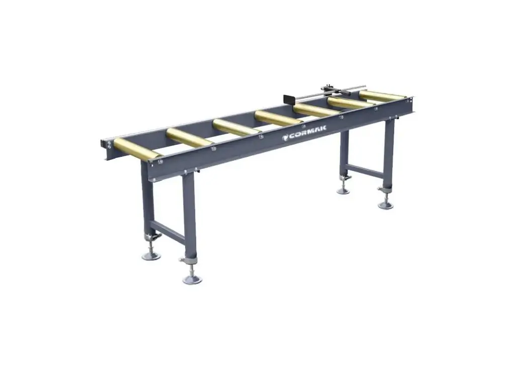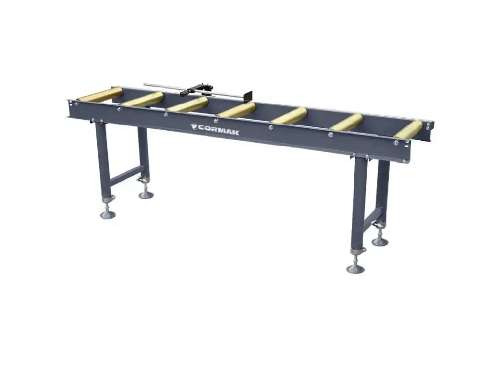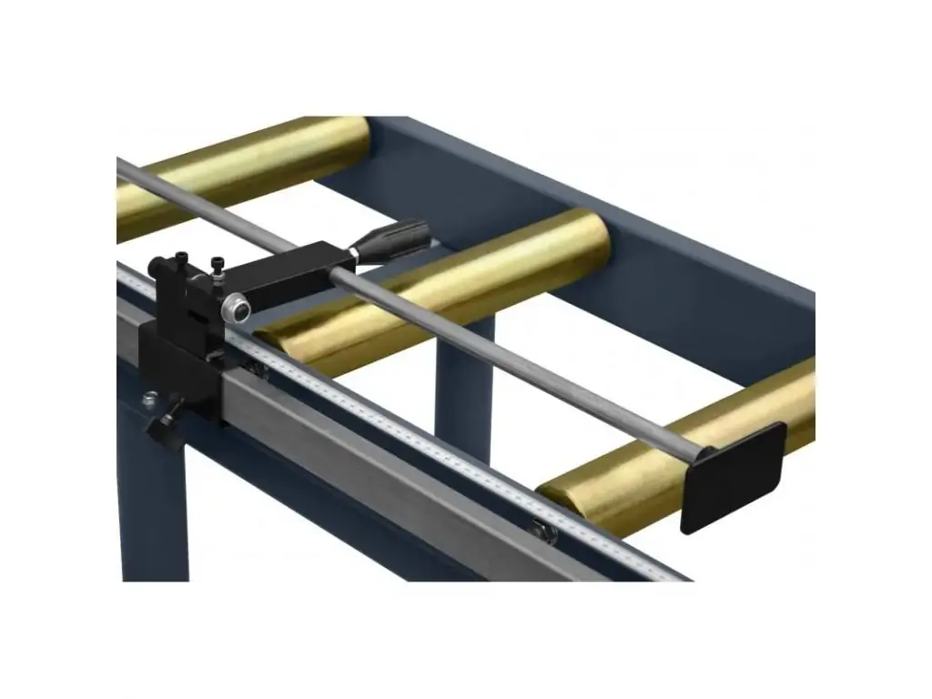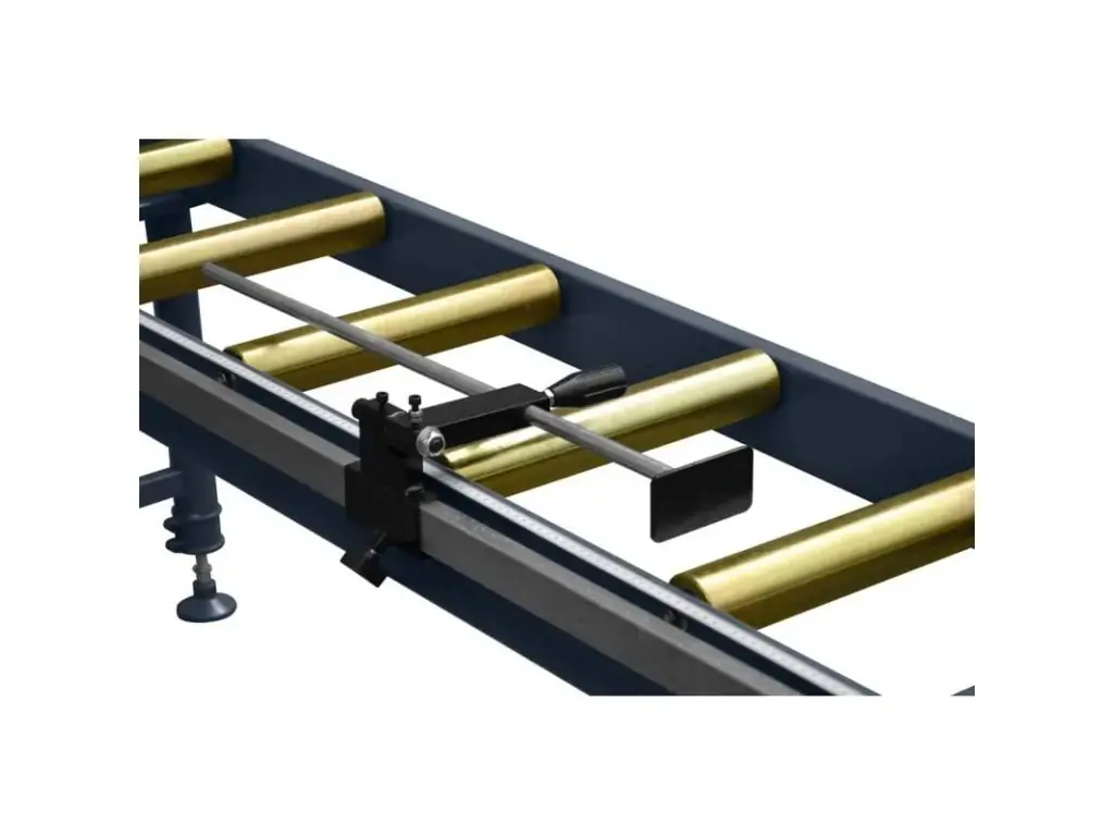 Конвеєр оснащений 7 сталевими роликами діаметром 60 мм і довжиною 360 мм, які мають високу зносостійкість. Ролики встановлені на кулькових підшипниках, що забезпечує плавний і рівномірний хід вантажу. Рама виготовлена зі сталевого профілю високої міцності, що гарантує стабільність під навантаженням і збереження геометрії на весь термін служби. Вбудована лінійка з рухомим упором дозволяє швидко і точно вимірювати заготовки для розкрою без додаткового оснащення. Спеціальні отвори і кріплення на торцях дають змогу розширювати цей роликовий конвеєр з вимірюванням відповідно до вимог виробництва.