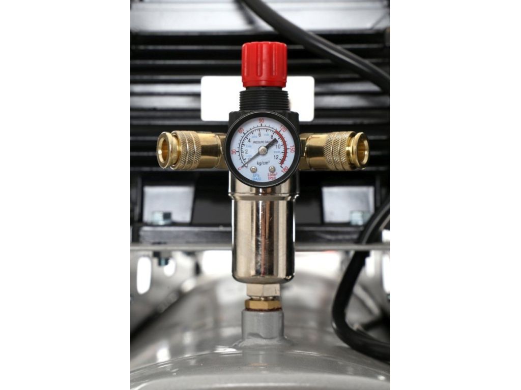 Эргономичный - он имеет редуктор давления, оснащенный инновационным механизмом регулировки, большой манометр, расположенный на компрессоре, облегчающем считывание параметров, и удобный сливной кран;