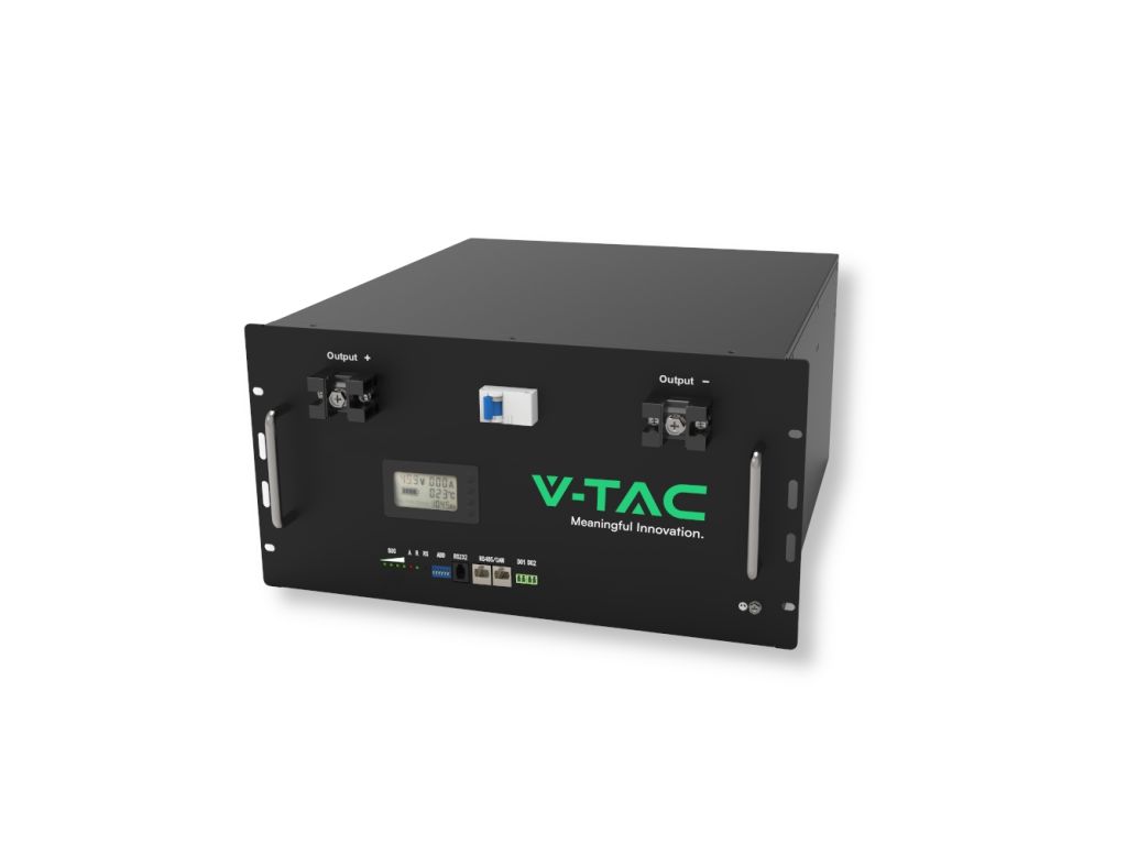 Накопитель энергии V-TAC использует литиевую батарею с напряжением 48 В и емкостью 200 Ач, предназначенную для фотоэлектрических инверторов. Он способен хранить электроэнергию до максимальной емкости 9,6 кВт-ч. Этот аккумулятор может быть установлен в стойку с номером SKU 11557.