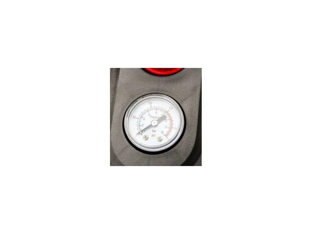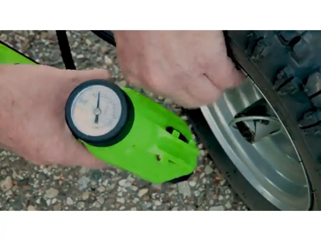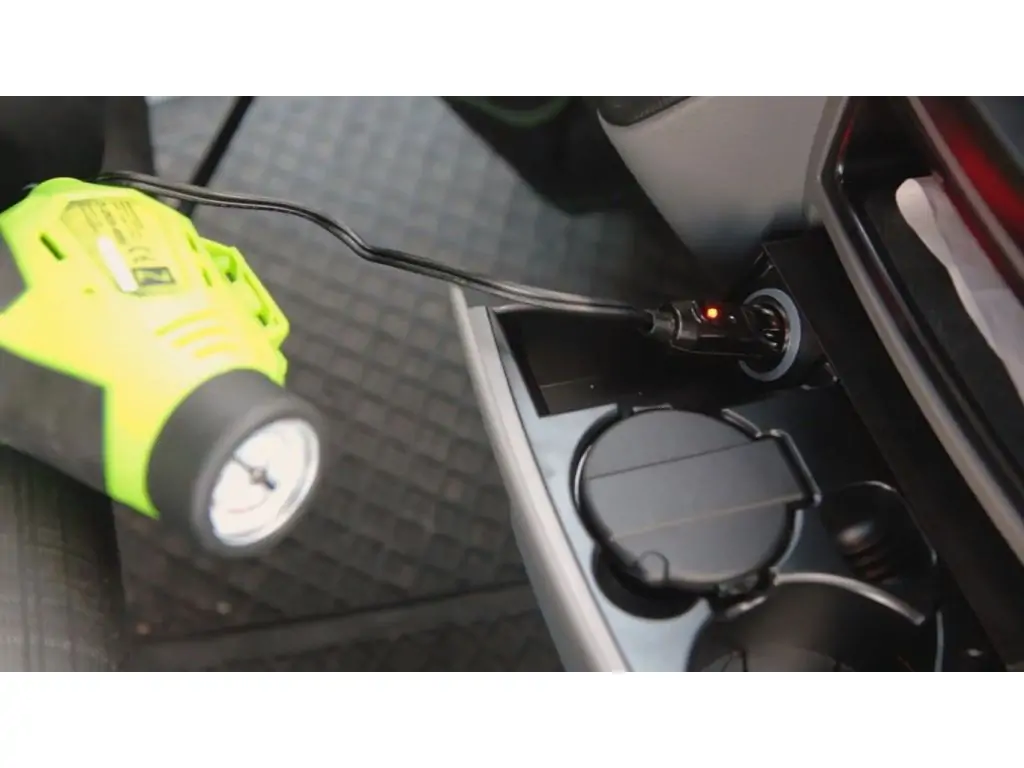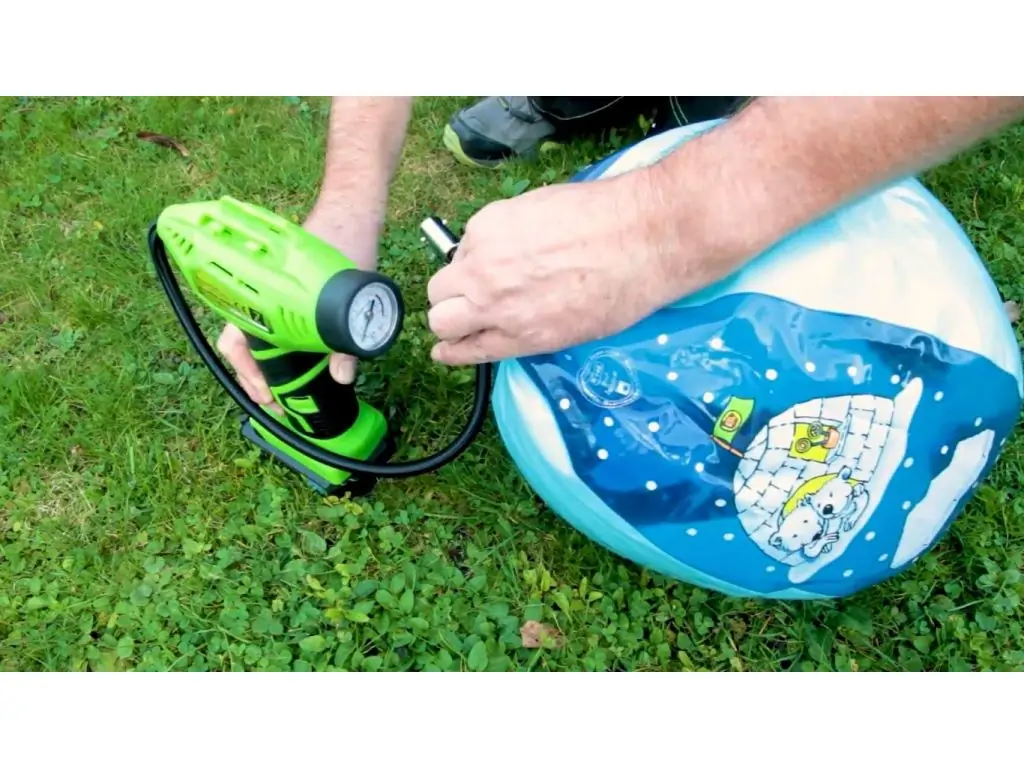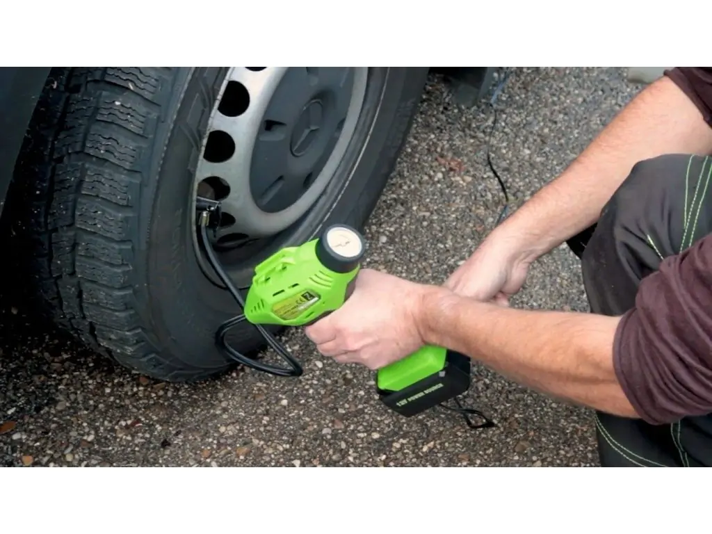 Компрессор обеспечивает максимальное давление 6,8 Бар, для контроля давления есть манометр. Гибкий шланг длиной 50 см и 3 адаптера (для мячей, для велосипедных шин и конический адаптер) обеспечивают удобную и легкую эксплуатацию. Устройство может непрерывно работать до 5 минут, после чего требуется остановка для охлаждения. Компактный размер и вес около 2 кг позволяют брать этот портативный компрессор на аккумуляторе с собой в дорогу и хранить его в багажнике автомобиля.