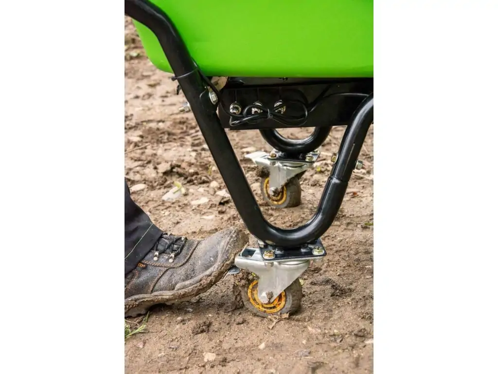 Кузов и рама изготовлены из прочной стали с антикоррозионным покрытием. Емкость кузова 75 л позволяет за один ход перевозить значительный объем материалов. Ведущее колесо имеет большой диаметр и глубокий протектор, что обеспечивает отличную проходимость по всем рельефам. Для улучшения стойкости есть опорные колеса. Эта электрическая садовая тачка имеет эргономичные ручки управления, на правой из которых расположены элементы управления запуском и скоростью. Для контроля работы есть индикатор заряда аккумулятора.