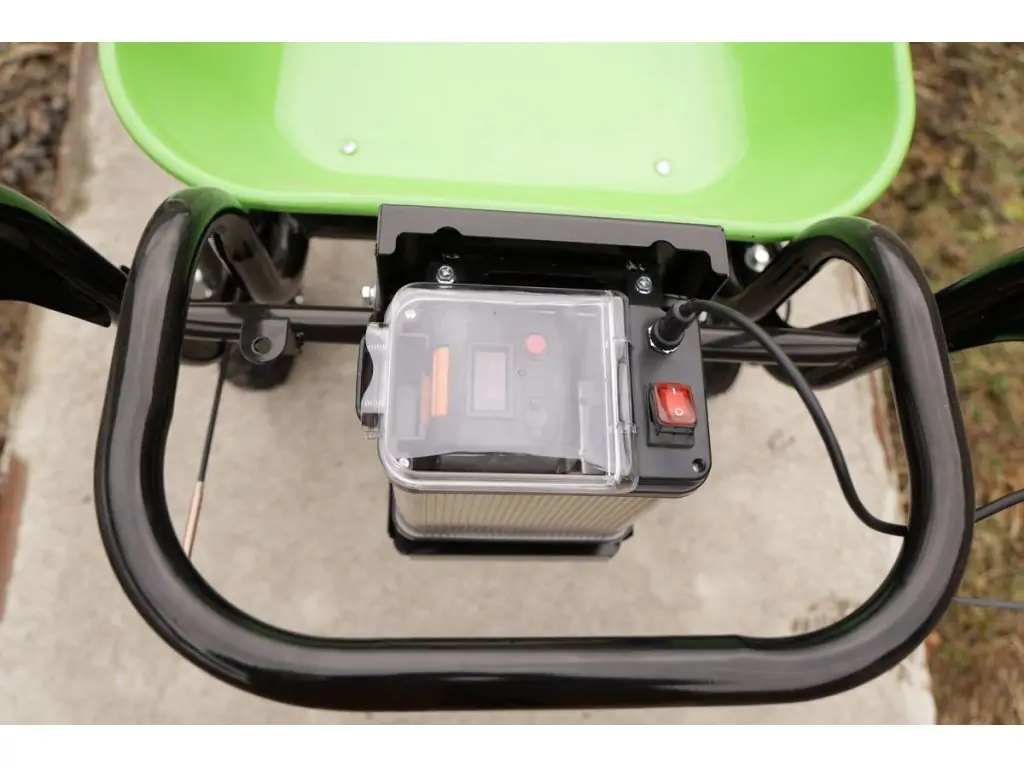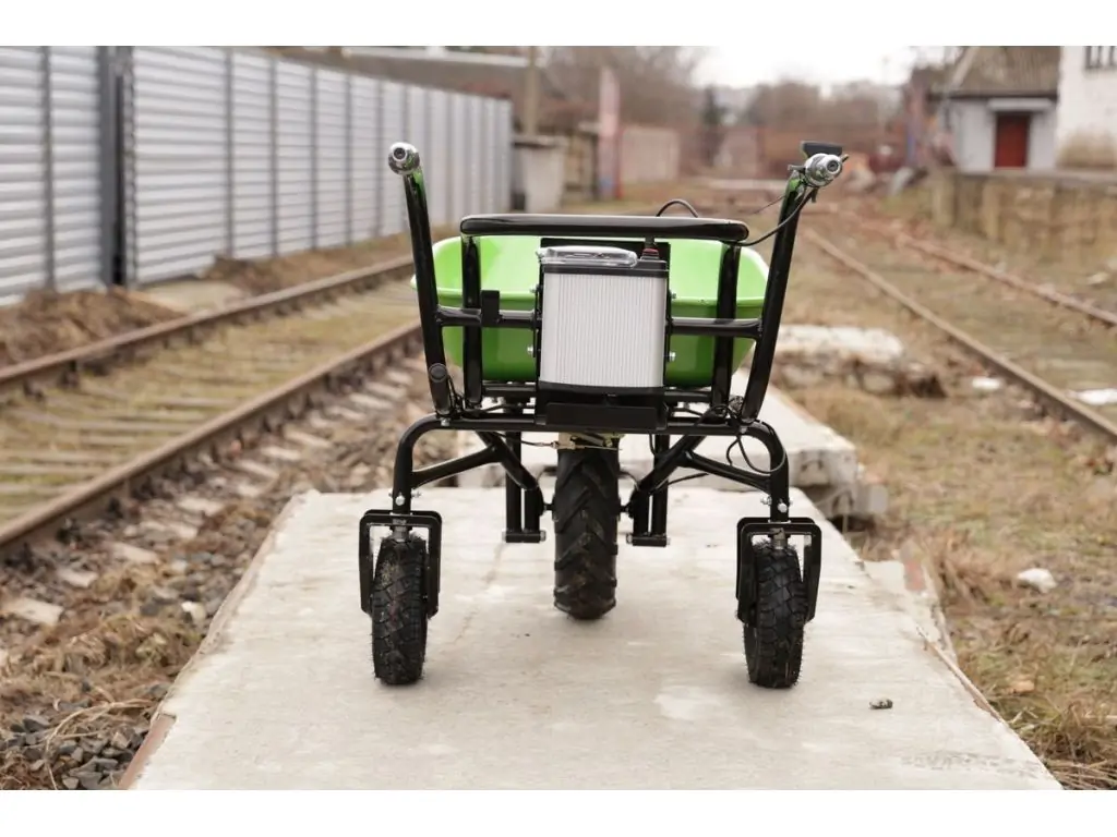 Тачка совершает движение вперед и назад. При полном заряде аккумулятора может работать непрерывно до 8 часов. Время зарядки составляет 3 часа.