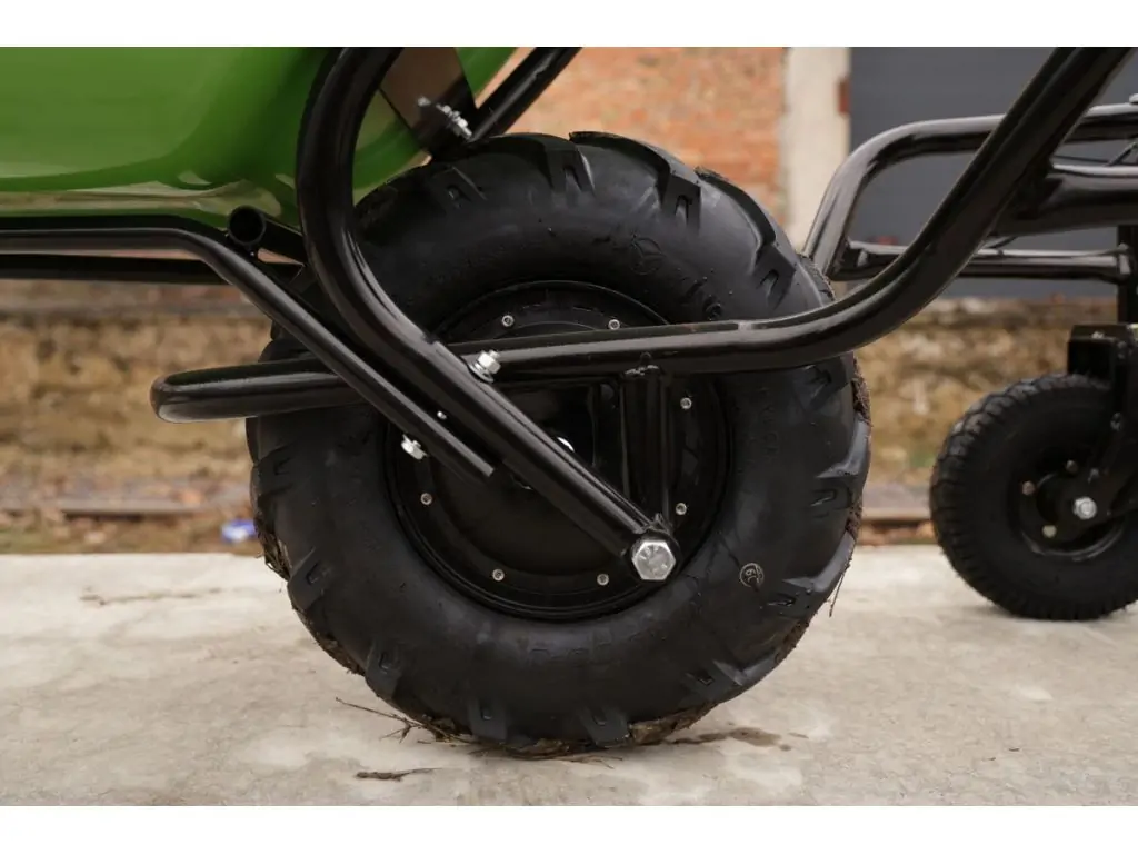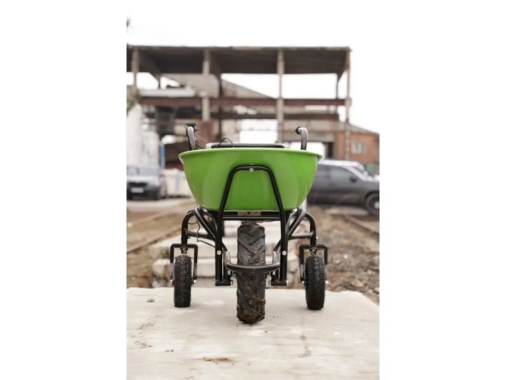 Большое ведущее колесо, оснащенное электроприводом 280 В, и два опорных колеса обеспечивают маневренность тачки, ее устойчивость и проходимость на разных типах местности. Прочное 80-литровое корыто с порошковым покрытием откидывается вперед для легкой выгрузки материалов. Качественные материалы изготовления и надежная конструкция гарантируют износостойкость и длительный срок службы тачки.