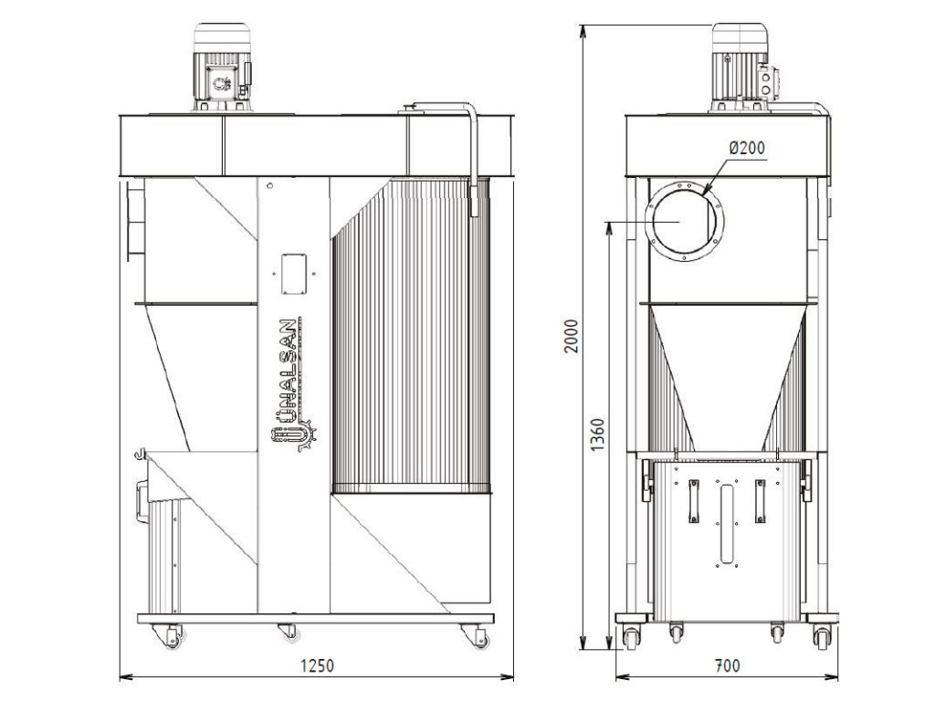 Расположенный снизу металлический контейнер на колесах для сбора большой отходной фракции от циклона, герметично фиксируется к аспирации двумя прижимными рычагами. Все отходы, за исключением мельчайшей фракции, попадают именно в этот контейнер, остальное фильтруется 2-х микронным фильтром и пыль собирается в нижнем полиэтиленовом мешке. Благодаря большой рабочей поверхности фильтра и высокой степени предварительной центробежной очистки, фильтр мало загрязняется, что дает стабильно высокую интенсивность всасывания от оборудования, даже при работе со шлифовальными станками.