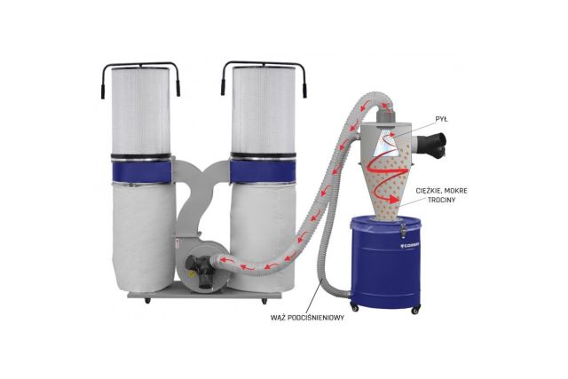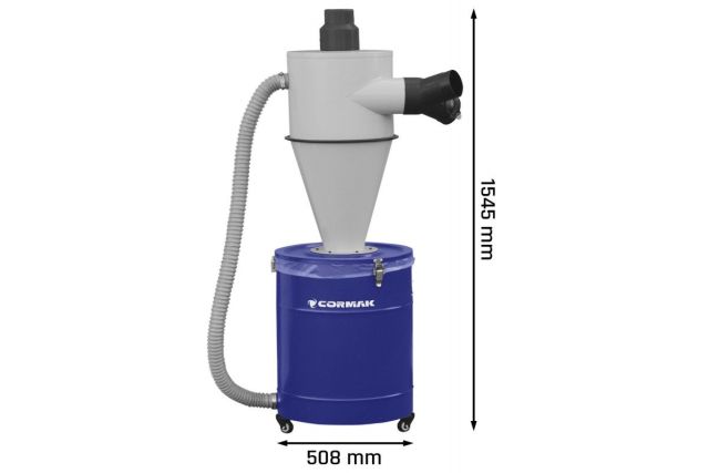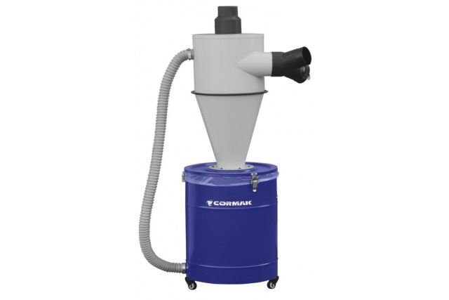 Циклонный фильтр CORMAK С118 подключается к вентилятору или вытяжке. Загрязненный воздух попадает в цилиндрическую камеру и вращается в ней, благодаря чему элементы тяжелее газа с центробежной силой выводятся наружу, ударяются о стенки и теряют свою энергию. Легкие частицы фильтруются через пылевой фильтр, а воздух удаляется через боковые стороны фильтра.
