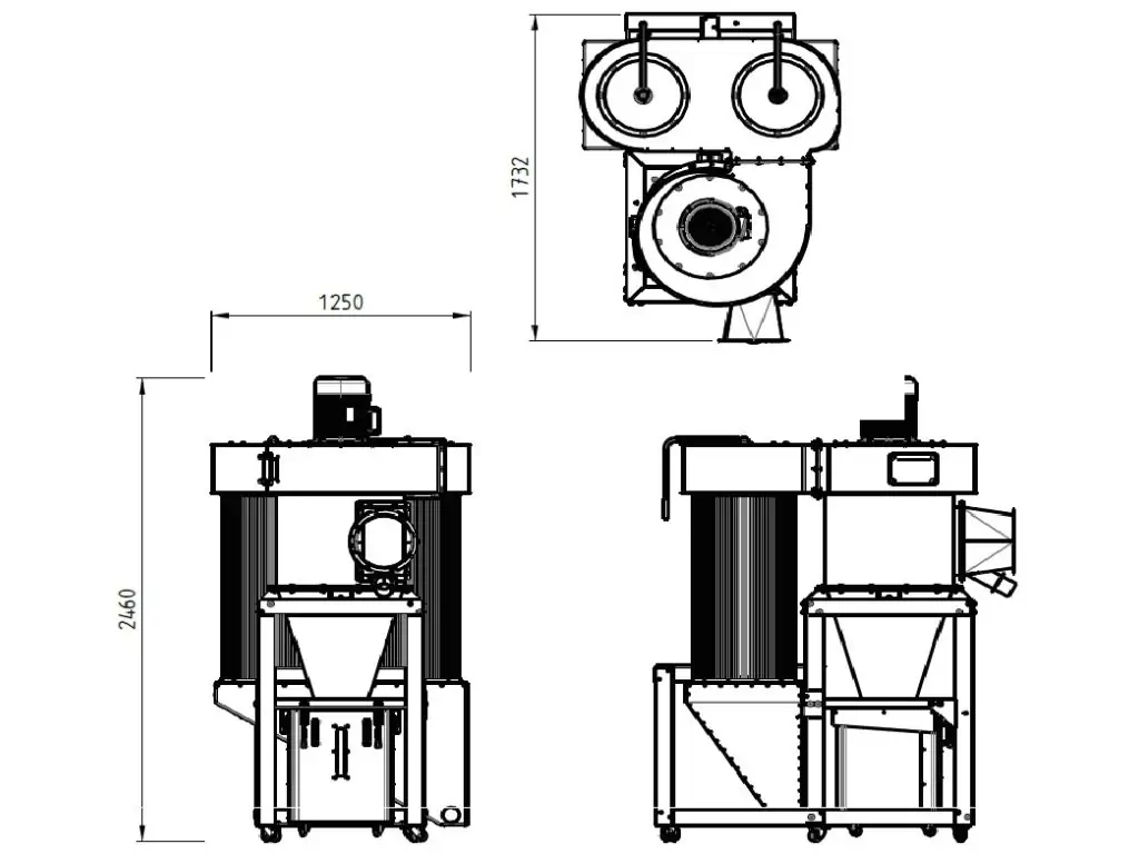 Расположенный снизу металлический контейнер на колесах для сбора крупной фракции отходов от циклона, герметично фиксируется к аспирации двумя прижимными рычагами. Все крупные отходы фильтруются именно в циклоне и попадают в этот мусорный контейнер, остальные мелкой пыли попадает на два фильтра и он собирается в нижнем конусе и через патрубок снова отводятся на фильтрацию в циклон. То есть в отличие от модели UNS 421, где мусор собирается и в контейнере и в полиэтиленовом мешке, в этой модели отходы будут собираться только в металлическом контейнере. Благодаря большой рабочей поверхности фильтров и высокой степени предварительной центробежной очистки, фильтры мало загрязняется, что дает стабильно-высокую интенсивность всасывания от оборудования, даже при работе со шлифовальными станками.