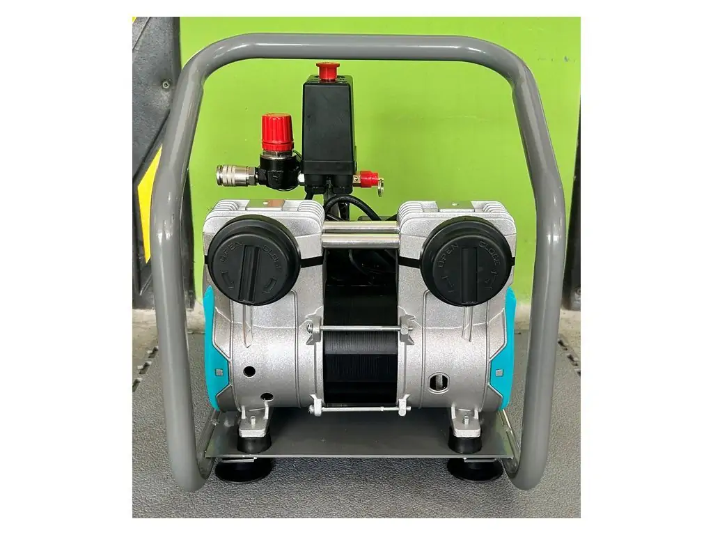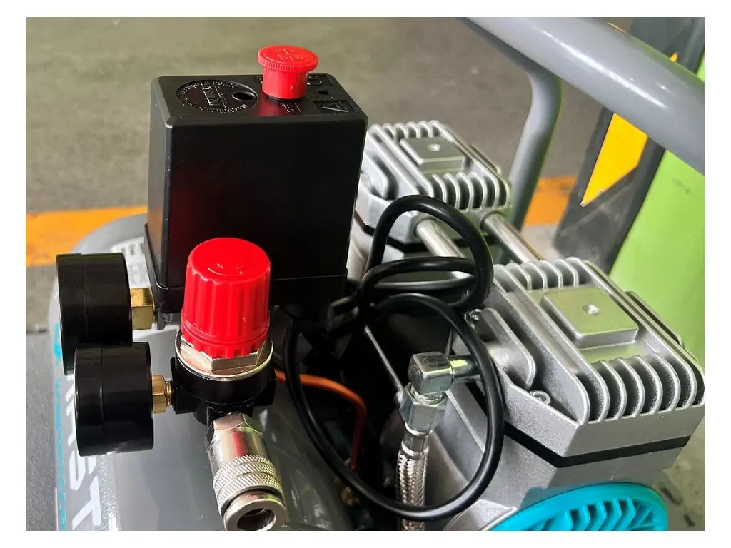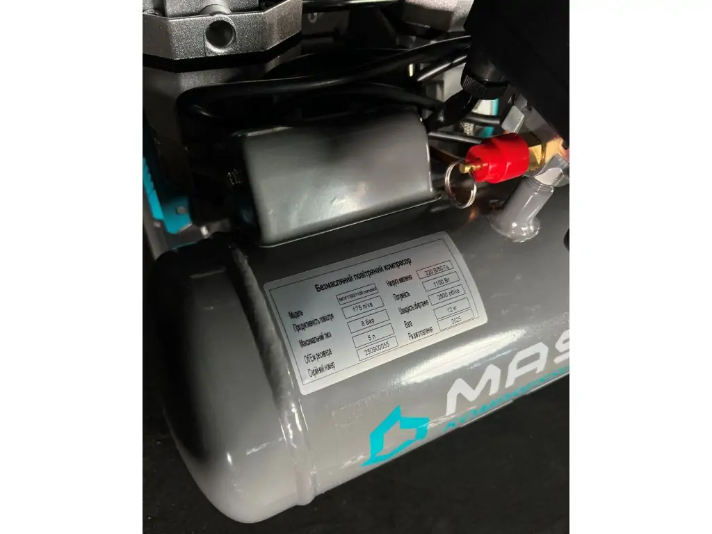 Двигатель мощностью 800 Вт/ 1,1 кВт имеет медную обмотку и тепловую защиту, что делает его устойчивым к перегреву. Прямой привод уменьшает потери мощности и делает конструкцию более легкой и компактной. Редуктор давления и 2 манометра (показывают давление в ресивере и на выходе с редуктора) позволяют корректировать и контролировать текущее давление. Резиновые ножки уменьшают шум и вибрации, а усиленная верхняя ручка позволяет легко перемещать этот портативный безмасляный компрессор по рабочей зоне.