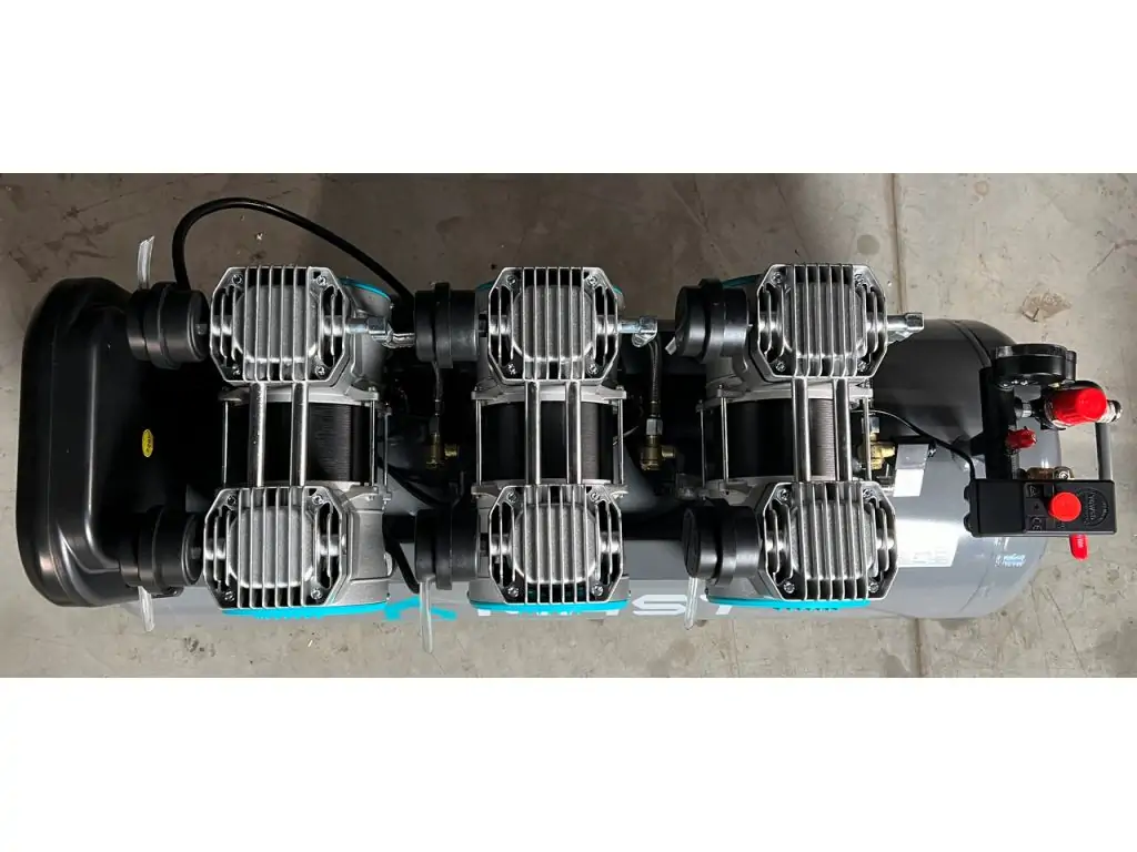 Безмасляный поршневой компрессор Mast MOF1680/3x1500-120L – это мощное оборудование, разработанное для отраслей, где требуется высокая производительность подачи и полное отсутствие масляного тумана в сжатом воздухе. Производительность 762 л/мин позволяет использовать модель для одновременного питания нескольких стоматологических установок, окрашивания больших поверхностей и подобных задач. Три компрессорных блока с отдельными двигателями мощностью 1,5 кВт каждый и возможность отдельного использования каждого блока обеспечивают стабильную, равномерную подачу сжатого воздуха и гибкость при частичной нагрузке. Благодаря наличию модуля последовательного запуска каждый последующий двигатель запускается с задержкой 2-3 с, что снижает пусковые токи и нагрузку на электросеть. Включение и выключение каждого двигателя отдельно позволяет при необходимости подключить компрессор к генератору малой мощности. Также модуль дает возможность контролировать напряжение питания и оснащен защитой от перегрузки.