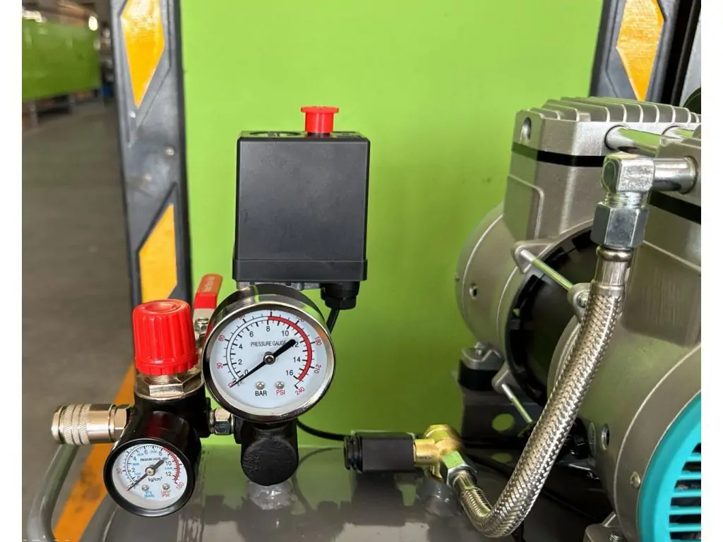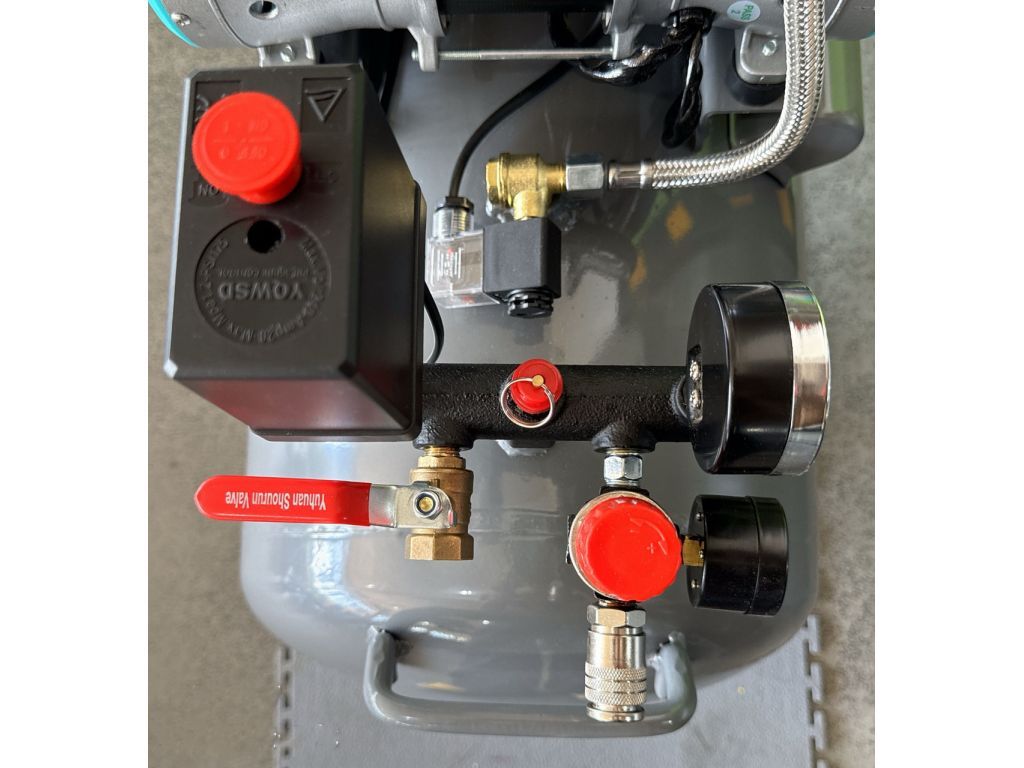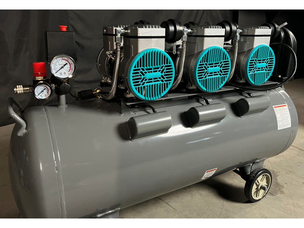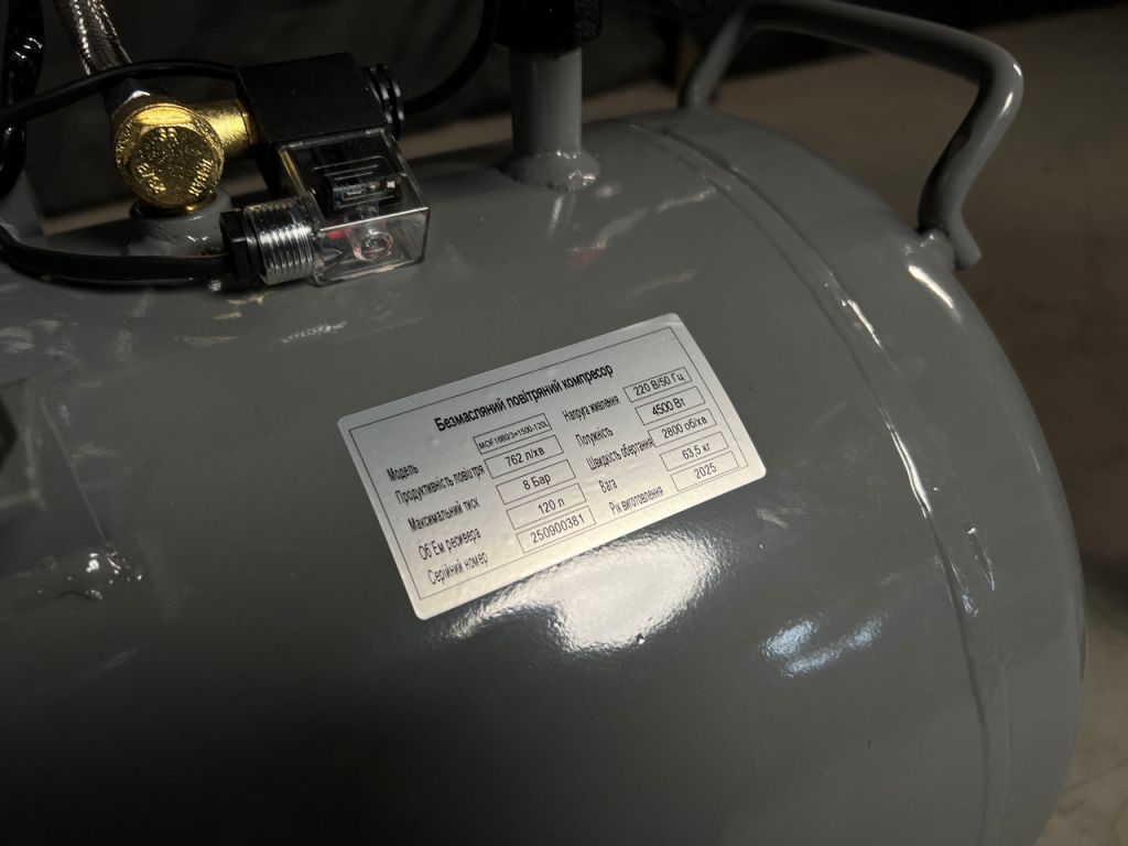 Ресивер объемом 120 л дает большой запас воздуха и стабильное давление при пиковых нагрузках. Поршни работают с самосмазывающимися тефлоновыми кольцами и антифрикционными материалами, что гарантирует полное отсутствие вкраплений масла. Этот безмасляный компрессор 120 л оснащен прессостатом, минимизирующим вмешательство оператора и обеспечивающим стабильный режим работы в мастерской. Для настройки и контроля рабочих параметров есть редуктор давления и два манометра, которые показывают давление в ресивере и выходе с редуктора. Важными преимуществами безмасляных компрессоров Mast являются низкий уровень шума и высокая производительность за счет больших оборотов двигателя и большого диаметра поршней.