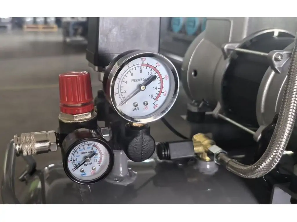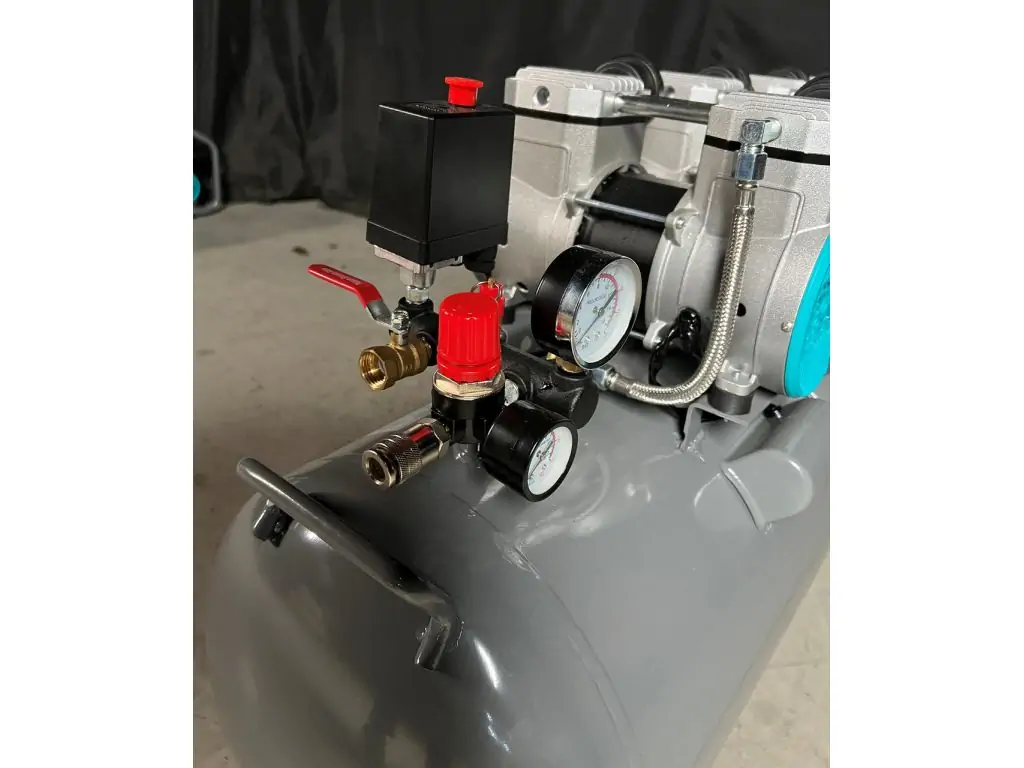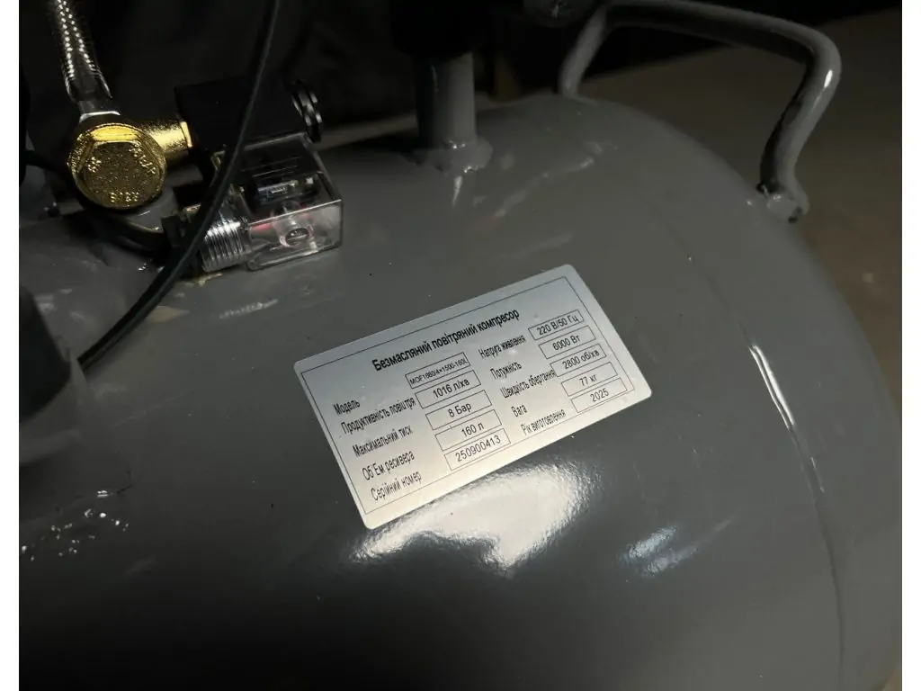 Ресивер объемом 160 л обеспечивает большой запас воздуха и стабильное давление при пиковых нагрузках. Массивные алюминиевые ребра цилиндров и 4 мощных вентилятора эффективно отводят тепло, предотвращая перегрев даже при интенсивной работе. Реле давления делает работу автоматической, минимизируя вмешательство оператора. Для настройки и контроля давления этот мощный безмасляный компрессор оборудован редуктором давления и манометрами в ресивере и на выходе с редуктора.