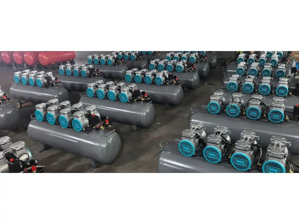 В многомоторном компрессоре вместо одного большого используется несколько меньших поршней. Они создают звук более высокой частоты, который легче заглушить корпусом фильтра и глушителем. Благодаря равномерному распределению блоков по всей длине ресивера, шум и вибрации распределяются и взаимно гасятся.