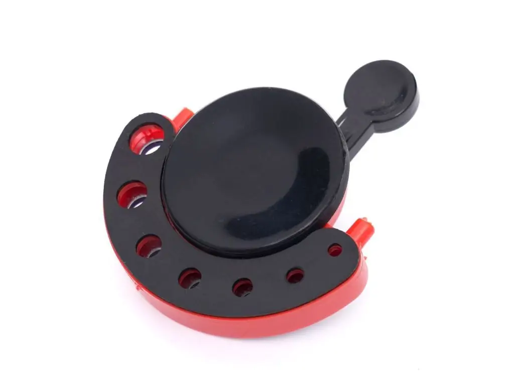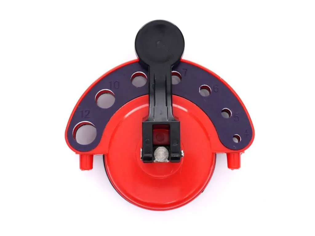 Он изготовлен из прочного ABS-пластика, поддерживает сверла размером 4-12 мм. Имеет крепкую присоску диаметром до 6 см и 7 направляющих отверстий диаметром 4, 5, 6, 7, 8, 10, 12 мм.