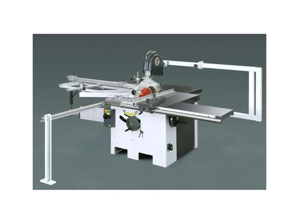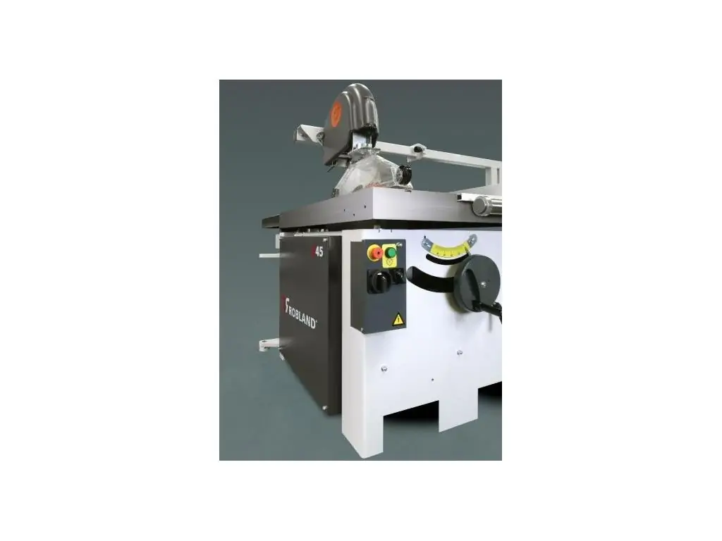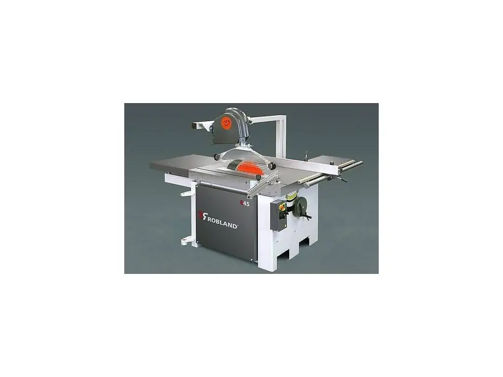 Круглопильный станок Robland E 45 предназначен для продольной, поперечной распиловки, а также распиловки под различными углами досок, брусков, клееного щита, плитных и листовых материалов из древесины различных пород и древесных материалов. Мощность двигателя станка 7,5 кВт. Станок выпускается как с кареткой, так и без нее. Станок, оснащенный фронтальной кареткой с поддерживающей телескопической опорой имеет жесткую направляющую и дополнительной поперечной телескопической линейкой с откидными упорами, с помощью которой можно производить торцовку деталей и раскрой плитных материалов. Пильный диск имеет регулировку по высоте и углу наклона к горизонтальной плоскости.
