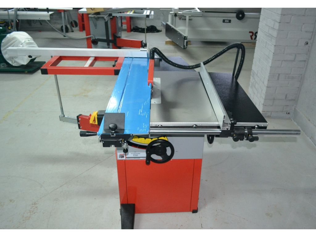 Комплект поставки: Твердосплавный пильный диск (HM) 254 мм, защитный кожух пильного диска с патрубком для вытяжной системы, обрезной башмак, удлинитель стола, расширитель стола, консоль, выдвижной телескопический упор, откидной упор, параллельный упор, толкатель