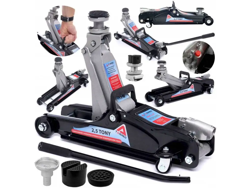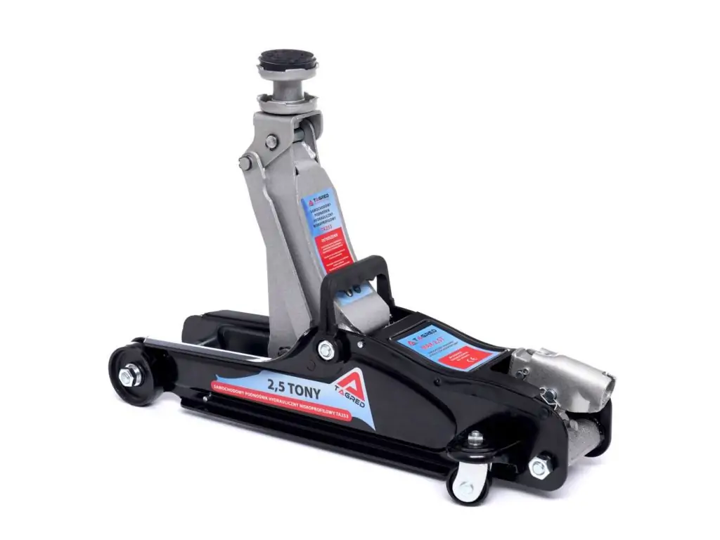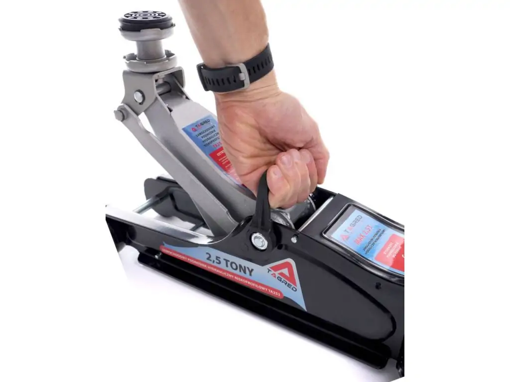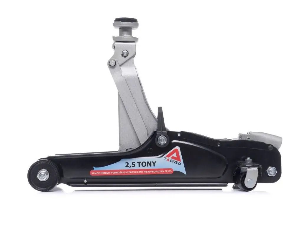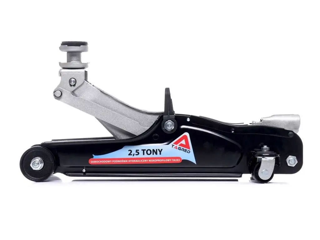 Автомобильный домкрат-лягушка TAGRED TA253 с грузоподъемностью 2,5 тонны, прочной, надежной конструкцией, съемной ручкой и колесами будет удачным приобретением для СТО, шиномонтажа и использования в собственном гараже. Поставляется с резиновой накладкой для защиты порогов авто и предотвращения скольжения поднятого автомобиля. Подходит для обслуживания большинства легковых автомобилей и микроавтобусов, а высота подхвата всего 85 мм без накладки и 95 мм с накладкой позволяет работать с низкими авто. Обеспечивает максимальную высоту подъема 355 мм без накладки и 388 мм с накладкой.
