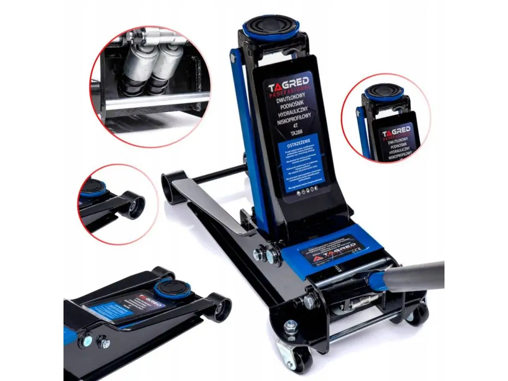 Двухпоршневой низкопрофильный домкрат TAGRED TA288 – является идеальным оборудованием для домашних гаражей и для любителей автомобилей, ценящих качество и высочайшую безопасность. Благодаря широким передним колесам и устойчивой конструкции подъемник позволяет легко поднимать транспортные средства весом до 4 тонн, устраняя любые протечки, вибрацию или изгибы. Это незаменимое оборудование для тех, кто ожидает высочайшего качества и бескомпромиссной безопасности.