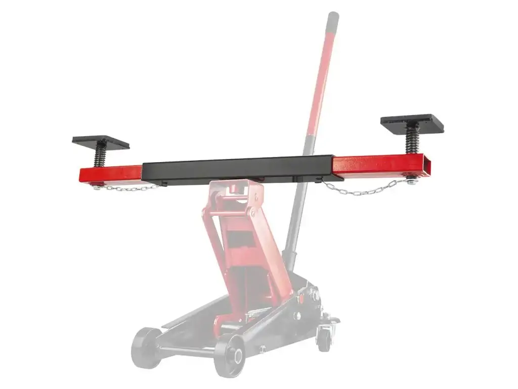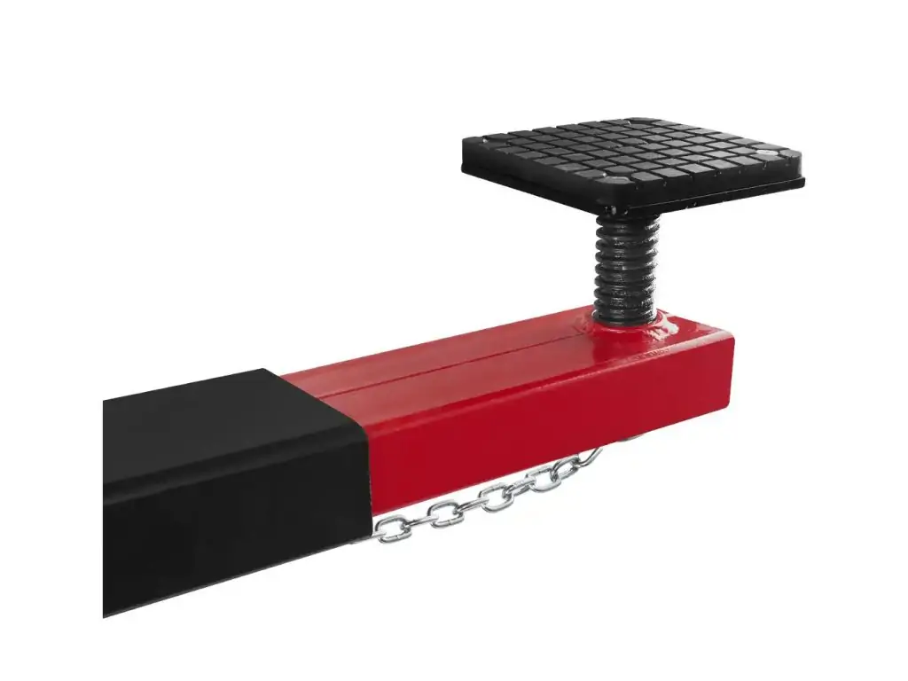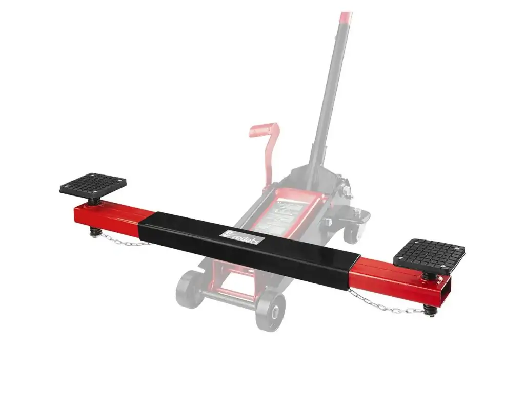 Траверса – это специальная поперечная балка, которая устанавливается на подъемную платформу домкрата. Такое устройство позволяет удобно работать с высокими автомобилями и поднимать авто в 2 точках одновременно.
