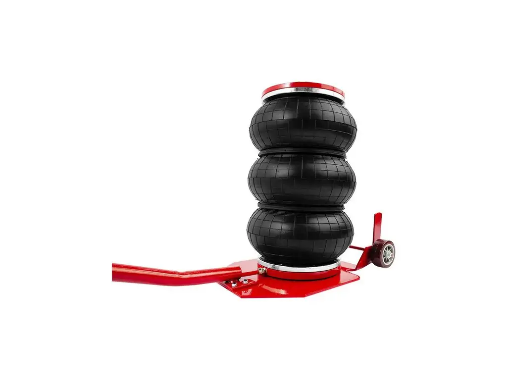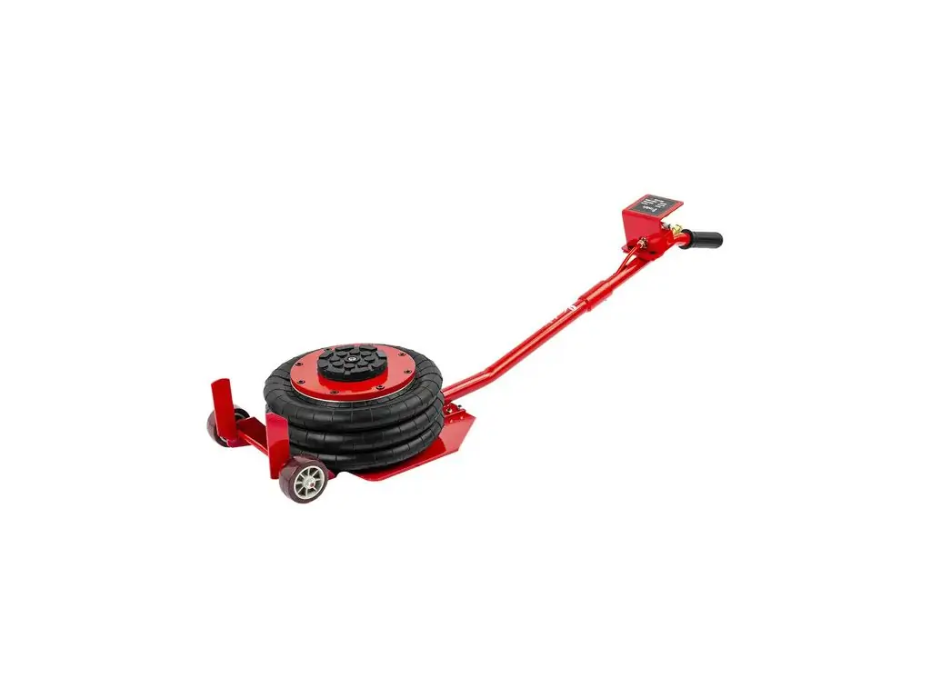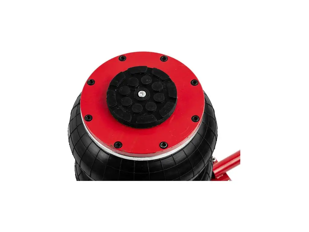 Сильфон имеет диаметр 270 мм и изготовлен из многослойной армированной резины, что обеспечивает его герметичность и износостойкость. В комплект поставки входит резиновая накладка, которая предотвращает скольжение автомобиля при подъеме. Благодаря длинной ручке и большим колесам этот пневмоподушечный домкрат можно легко и точно позиционировать под авто.