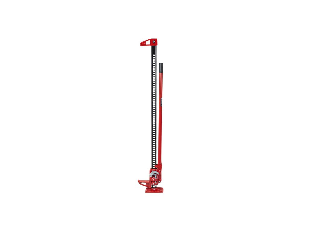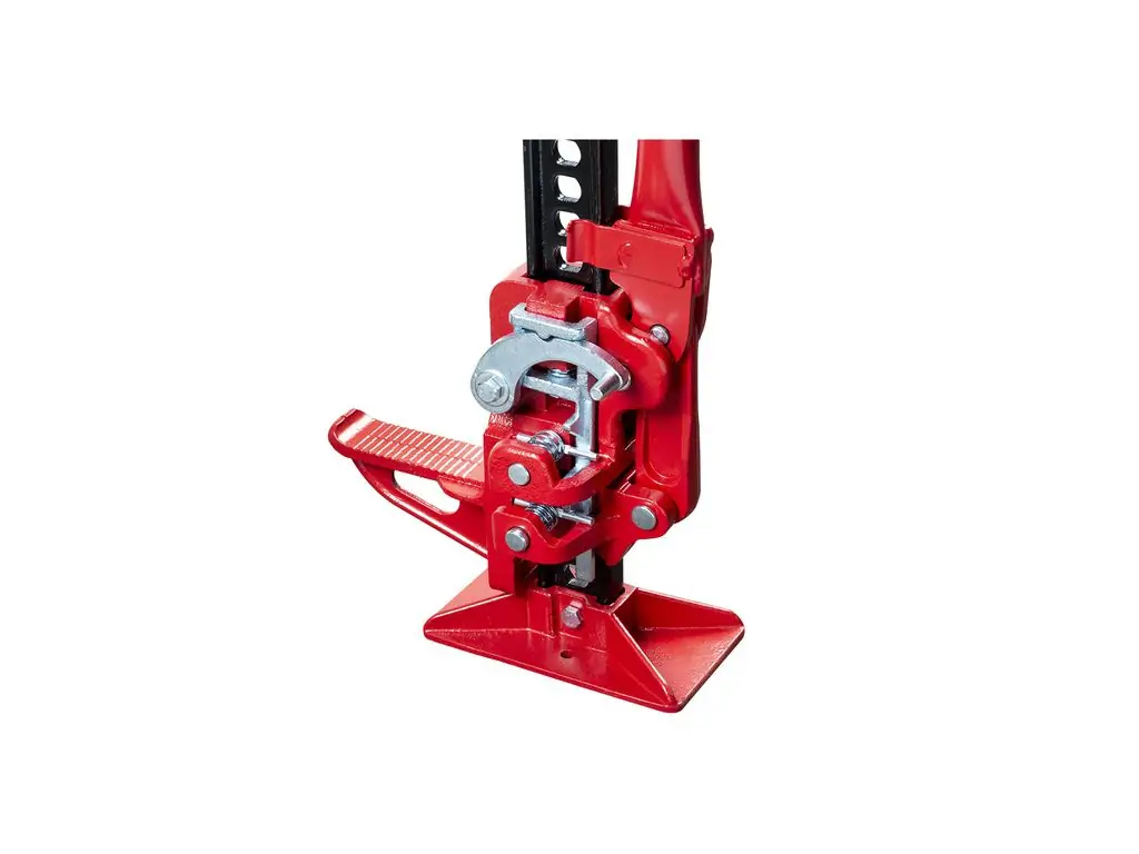 Перфорированная стальная рейка дает большой ход подъема, достигая высоты 1320 мм. Отверстия также позволяют крепить аксессуары или цепи. Большая длина рычага уменьшает нагрузку на оператора при подъеме груза. Полностью механический шаговый механизм подъема, состоящий из двух двойных стальных штифтов, остается надежным и безотказным даже в тяжелых условиях. Большая опорная пята делает домкрат более стабильным на песке или мягкой почве. Челюсть можно снять или повернуть, что превращает этот домкрат для бездорожья в струбцину или лебедку. Конструкция изготовлена из прочной стали и не имеет сложной электроники и гидравлики, что обеспечивает высокую износостойкость и долговечность в тяжелых условиях.