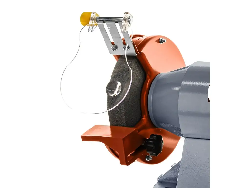 Станок оснащен 2 шлифовальными кругами разной абразивности диаметром 200 мм, которые установлены на прецизионных подшипниках, обеспечивающих их плавный ход. Скорость вращения 2950 об/мин позволяет быстро добиться желаемого результата. Оба круга дополнены прозрачными кожухами с увеличительным эффектом, которые защищают оператора от вылета стружки и обеспечивают оптимальную видимость рабочей зоны. Отверстия в станине позволяют надежно зафиксировать станок на рабочей поверхности. Так что если вы планируете купить электроточило для своей мастерской, эта модель оправдает ваши надежды.
